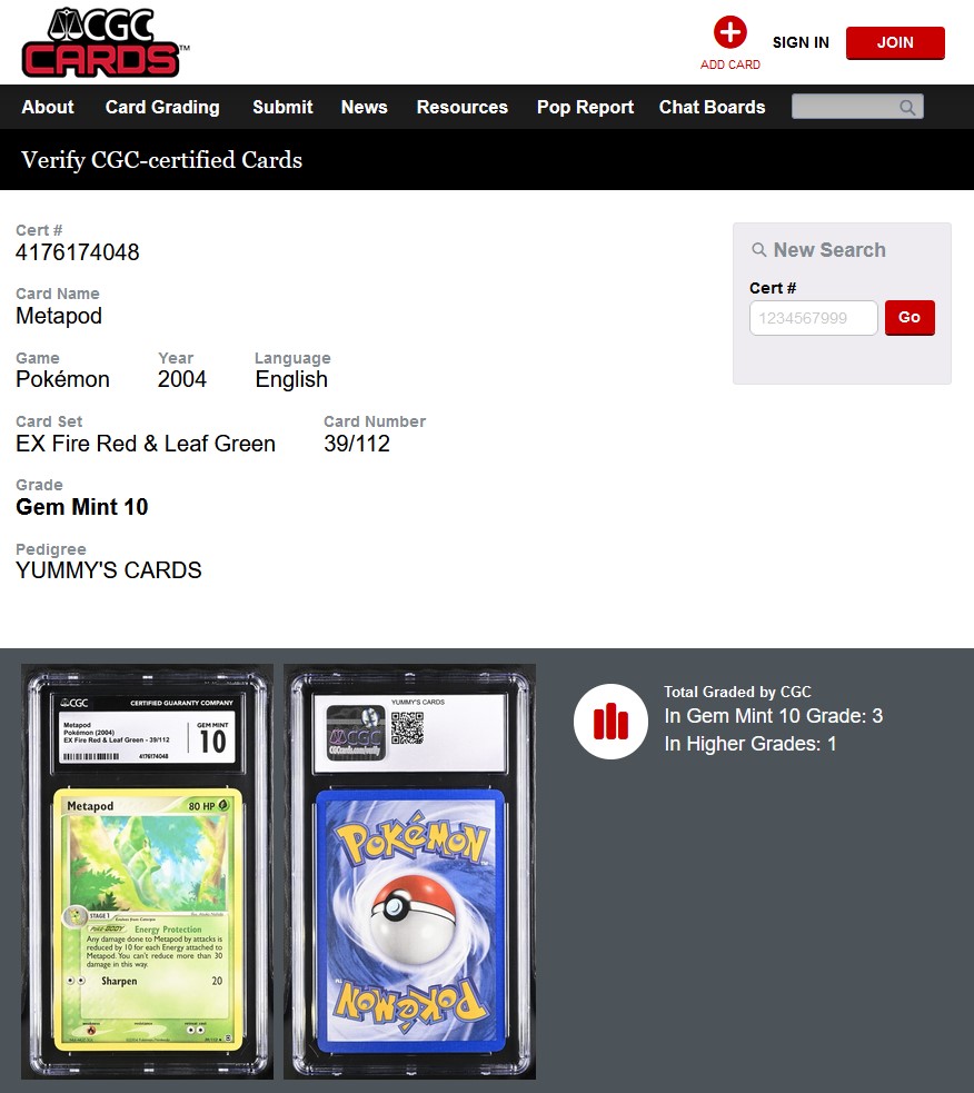 2004 Pokemon METAPOD #39 - EX Fire Red & Leaf Green - CGC GEM MINT 10 - RARE!!!! POP OF ONLY 3!!