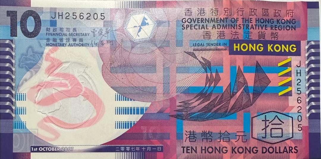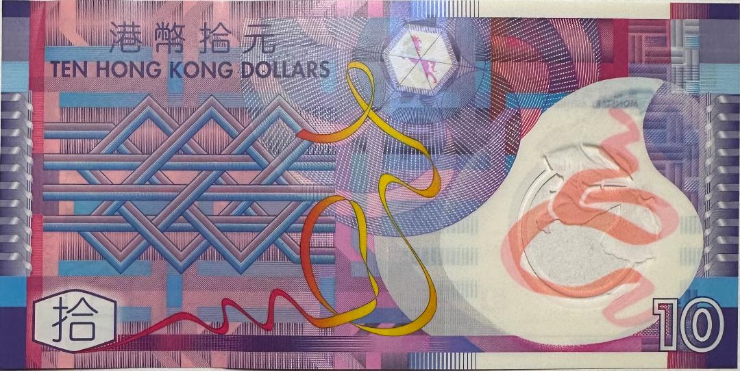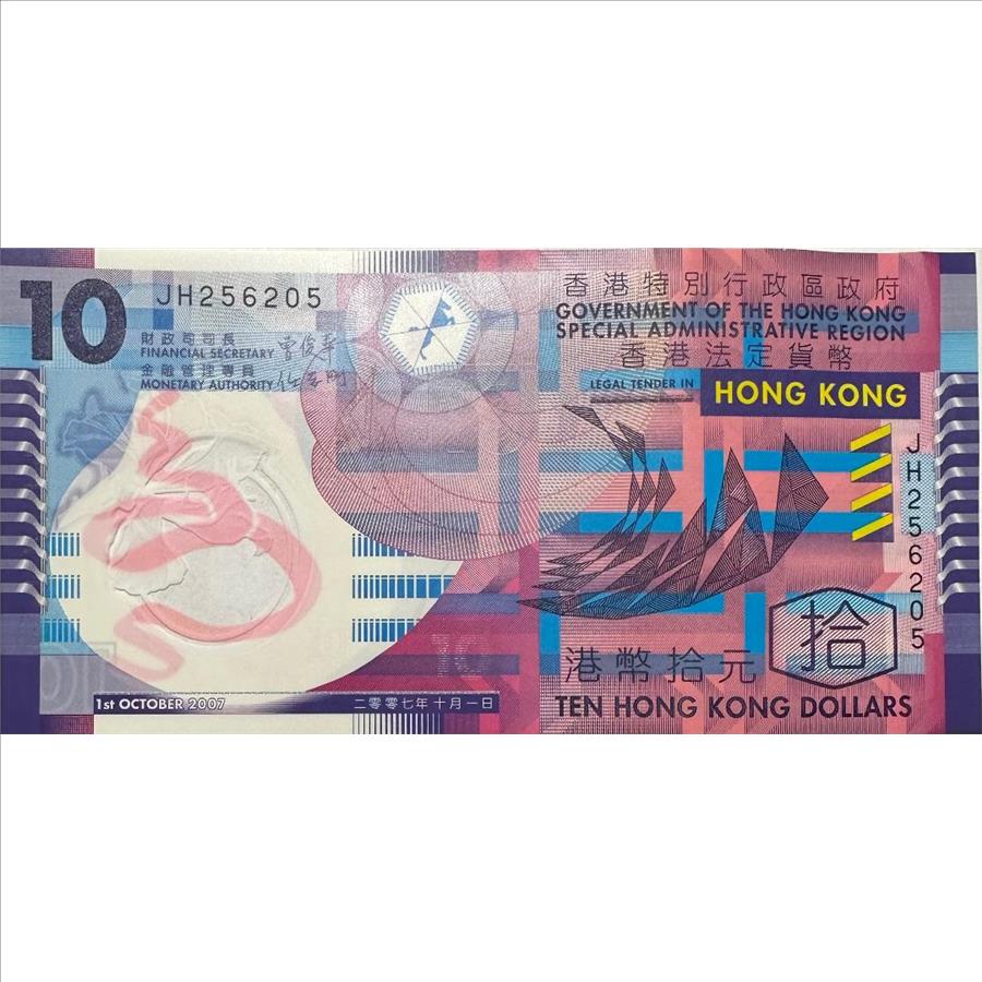 2007 Hong Kong 10 Dollars Note - Beautiful Vibrant Red, Blue and Purple Very Fresh Note