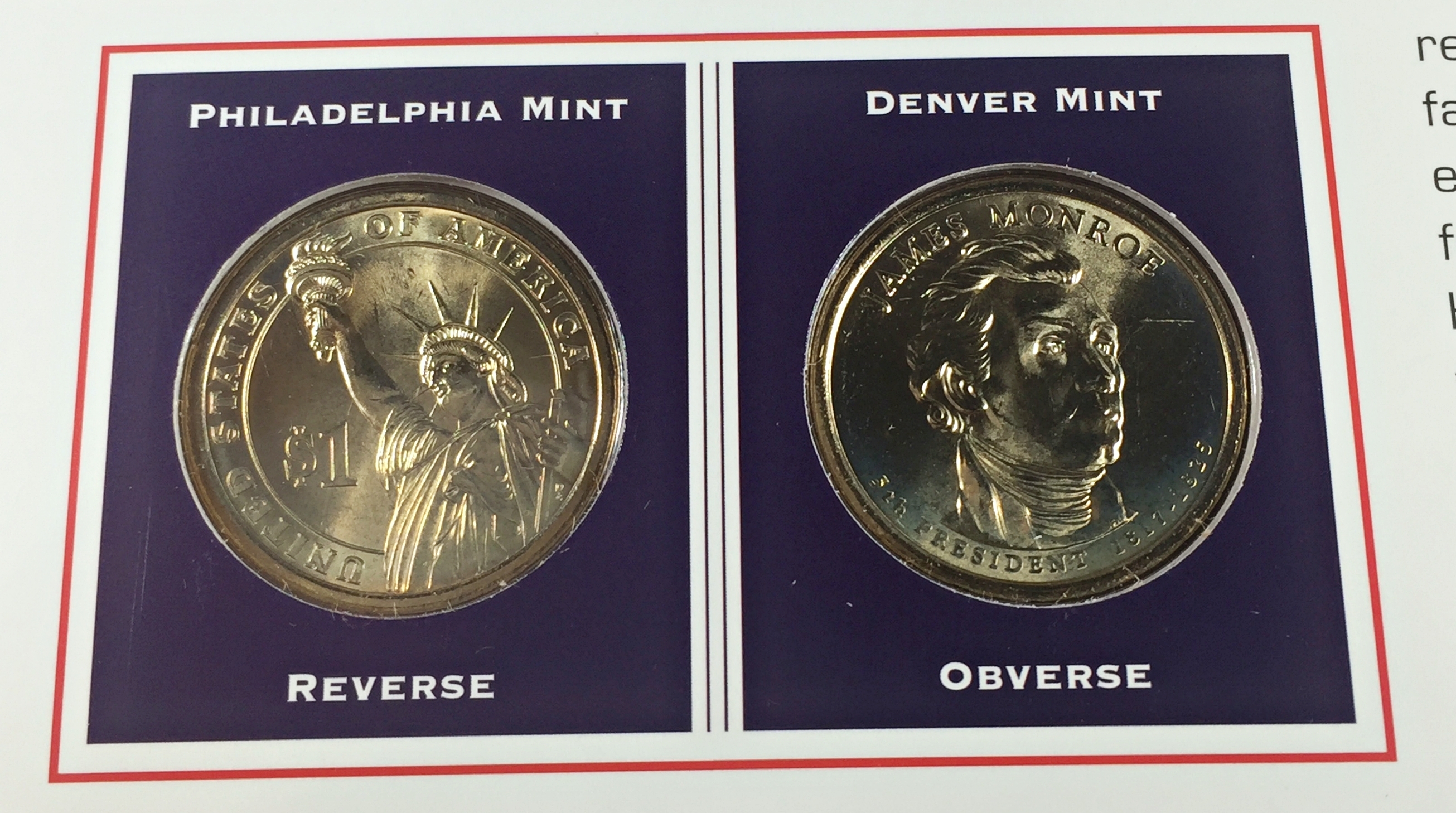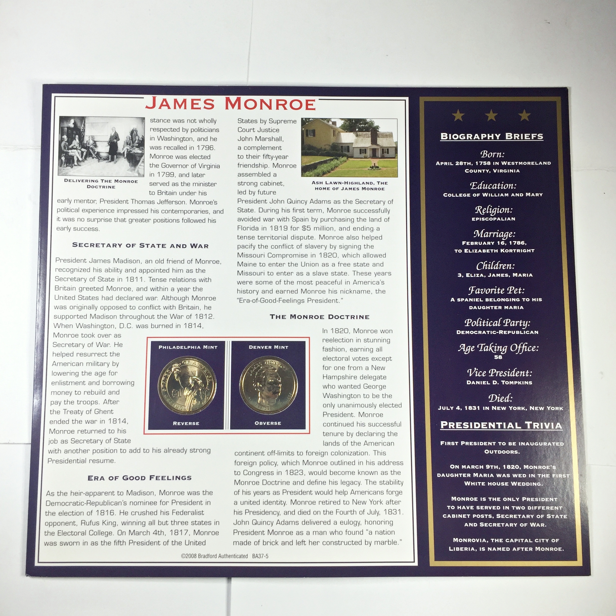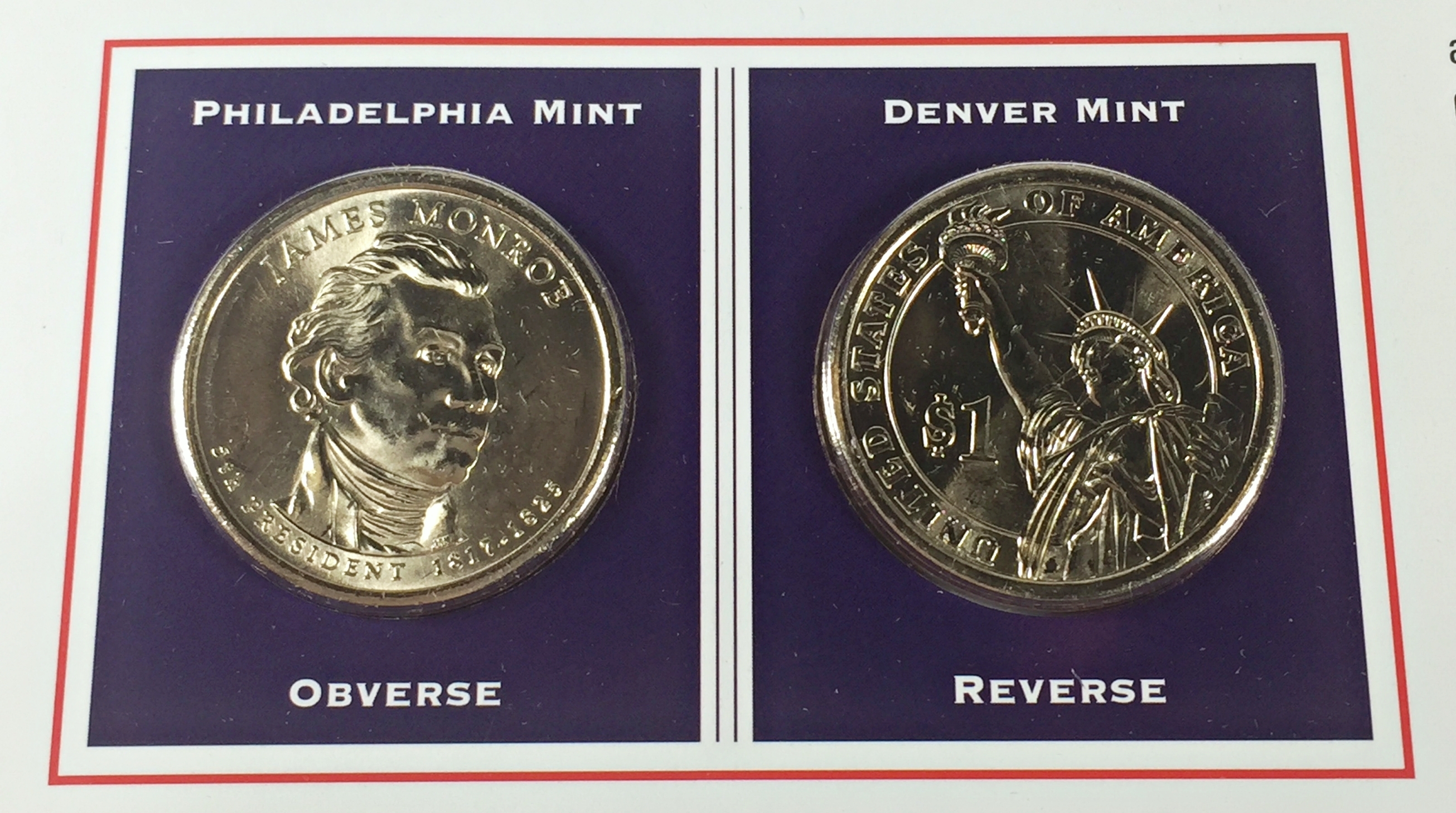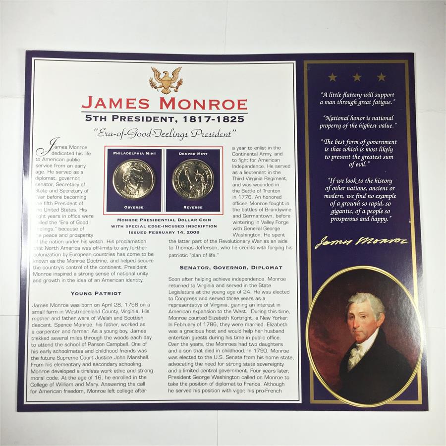 2008-P & D James Monroe Commemorative Presidential Dollars*Encased in 9" x 10" Story Board*Uncirculated