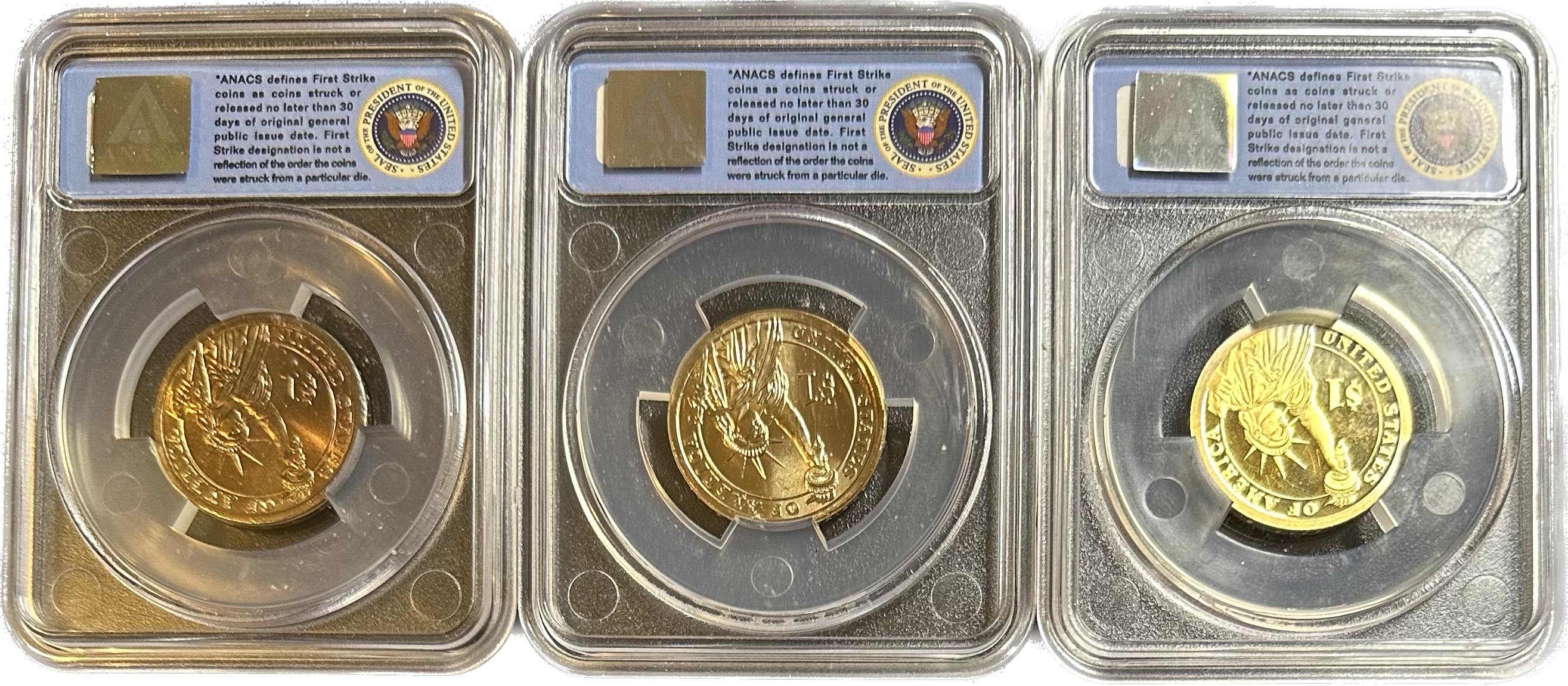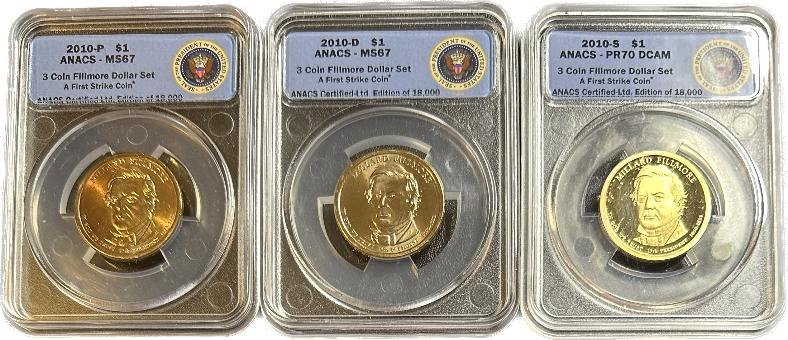 >2010 (P,D & S) Set of 3 ANACS Certified MS67, MS67 & PR70 DCAM Presidential First Strike Coins - Millard Fillmore