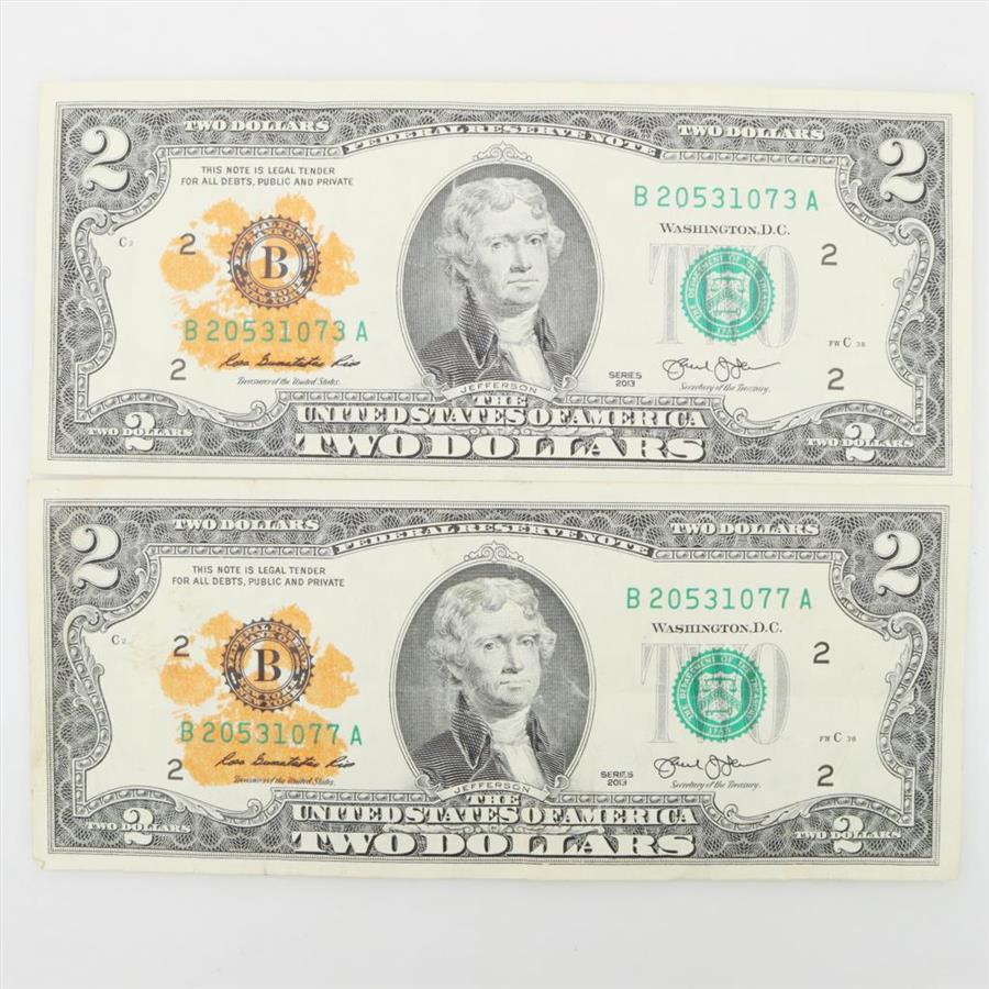 2013 Clemson US Federal Reserve Note $2 Dollar Bills, 2 Pieces