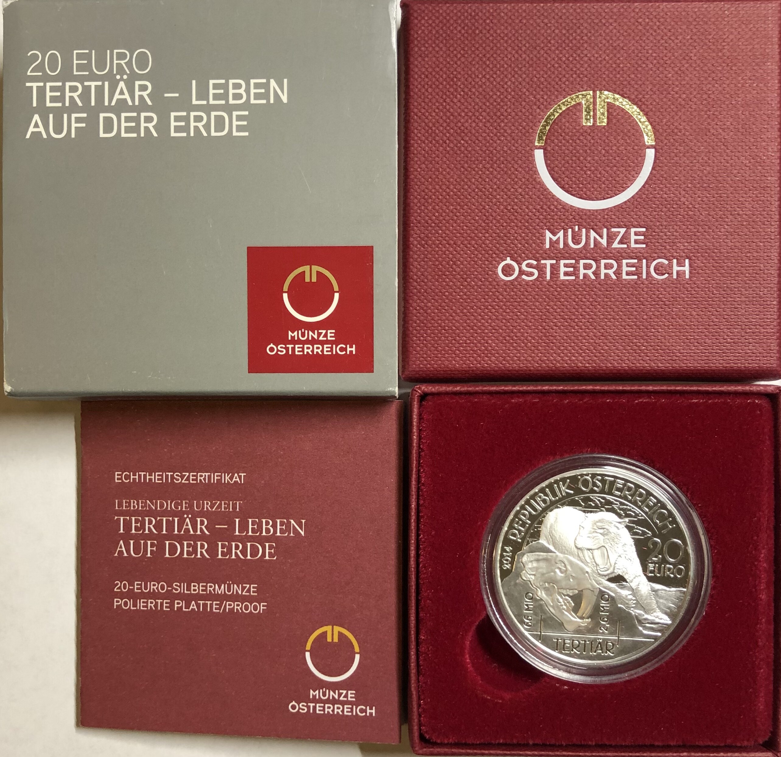 >2014 Austria Silver Proof Republic of Osterreich 20 Euro Coin - Prehistoric Life - Tertiar - Box & COA #20523 of 50,000