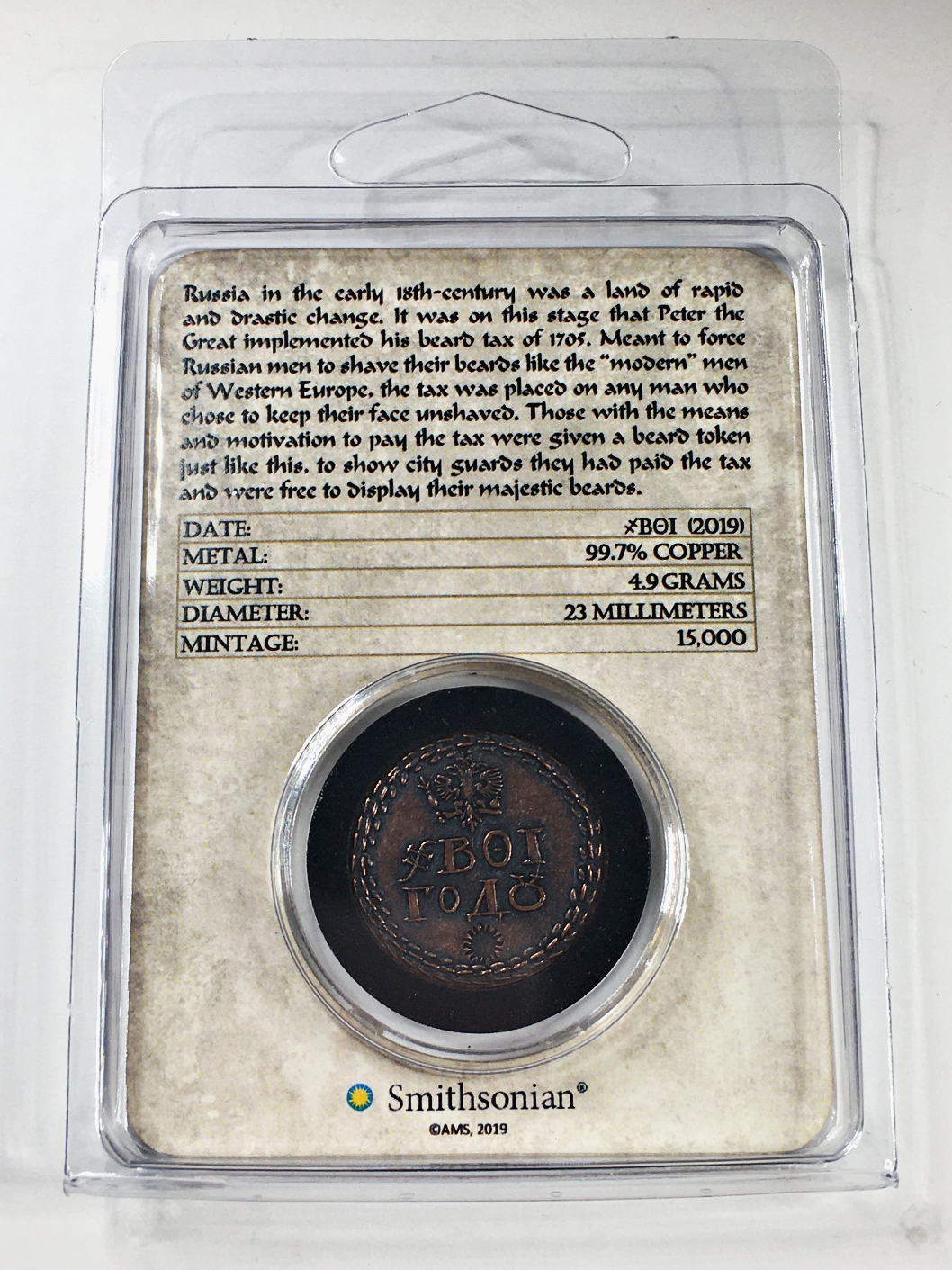 2019 Antiqued Copper Russian Beard Token*4.9 grams 99.7% Copper*Only 15,000 Minted by the Smithsonian