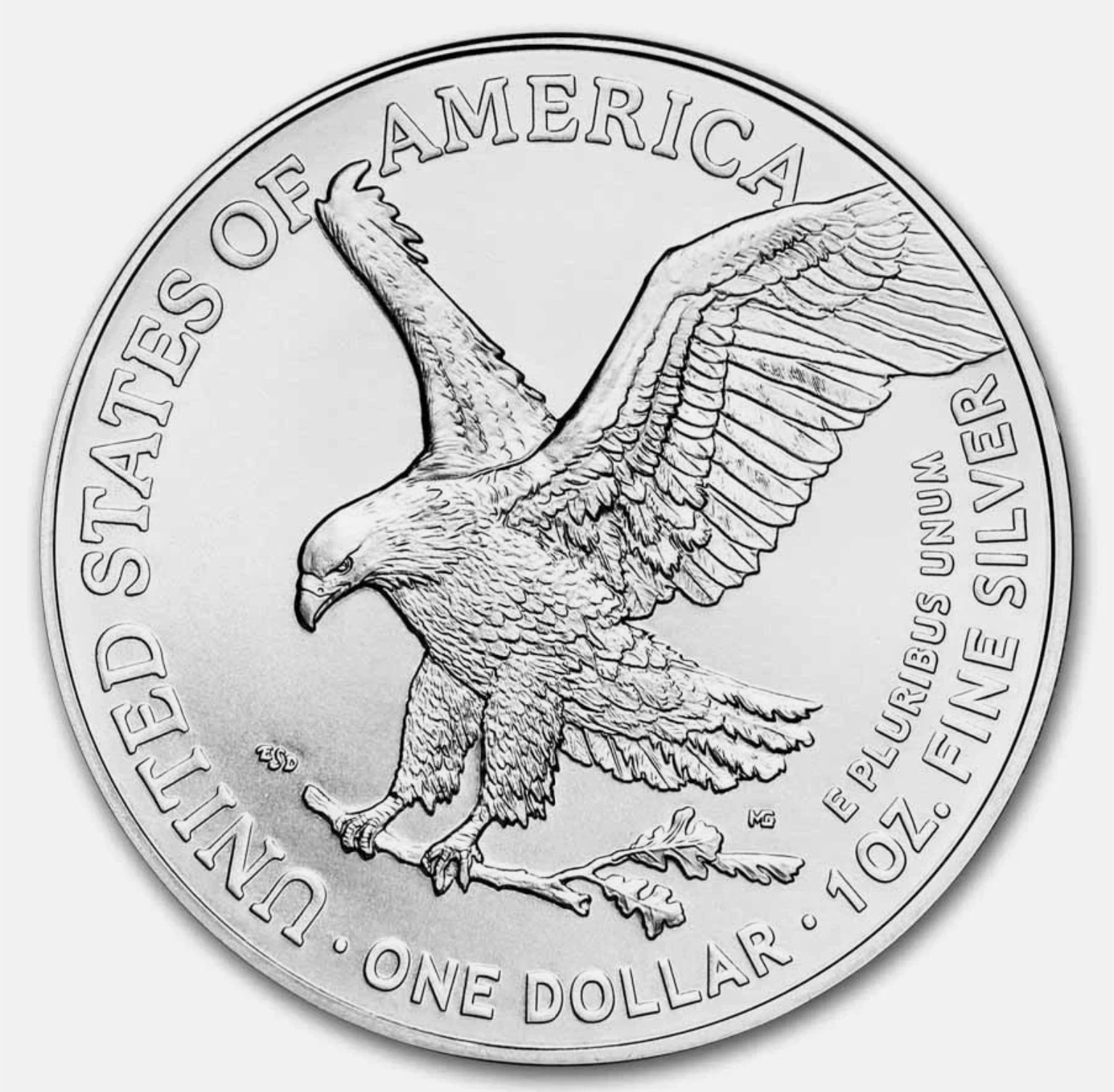 • Reverse: The design depicts a single eagle coming in for a landing, carrying an oak branch as if to add it to a nest. Inscriptions are “UNITED STATES OF AMERICA,” “E PLURIBUS UNUM,” “1 OZ. FINE SILVER” and “ONE DOLLAR.”