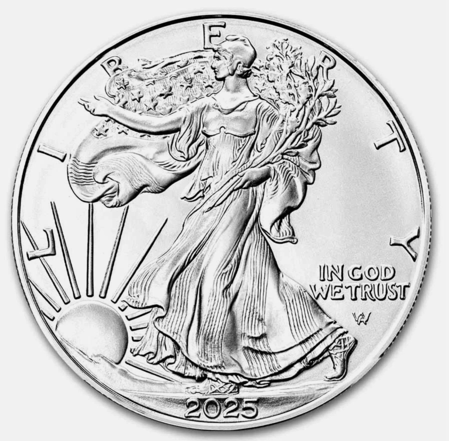 • Obverse: Adolph A. Weinman’s design showing Lady Liberty draped in an American flag, walking gracefully as the sun rises over a ridge.