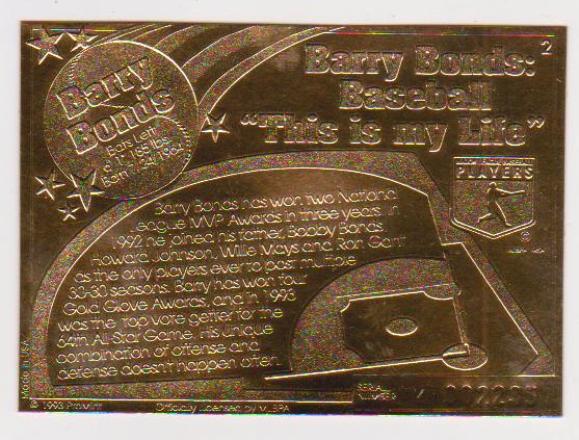 22 kt Gold Barry Bonds 1993 Pro Mint Gold Baseball Card - Sharp