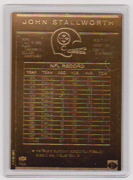 This is a Danbury Mint John Stallworth 22 kt gold football trading card.  This is still sealed in the holder from the mint.  This is a sharp looking card of this NFL Hall of Famer.