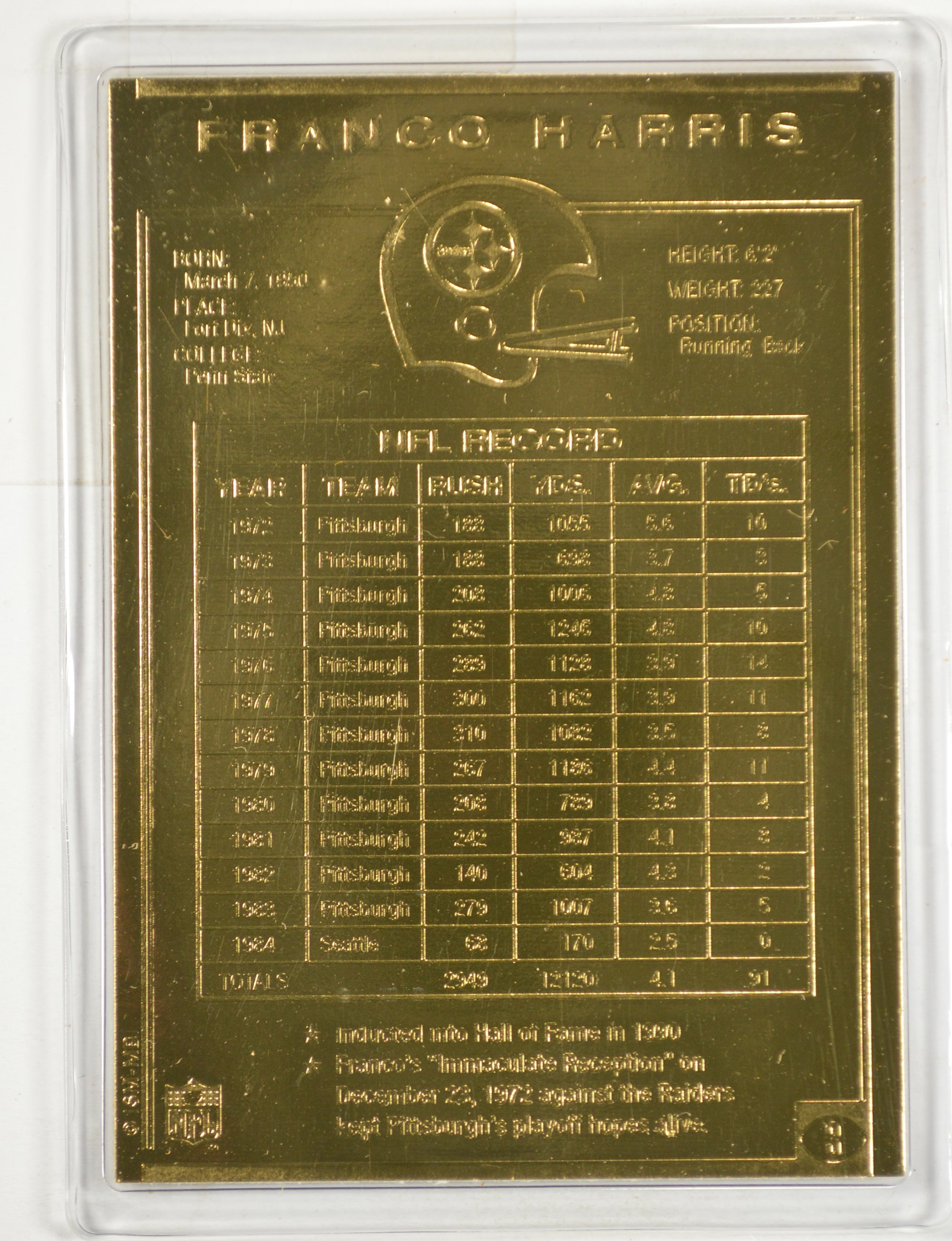 22K Gold Franco Harris Limted Edition Danbury Mint Football Trading Card - Beautiful