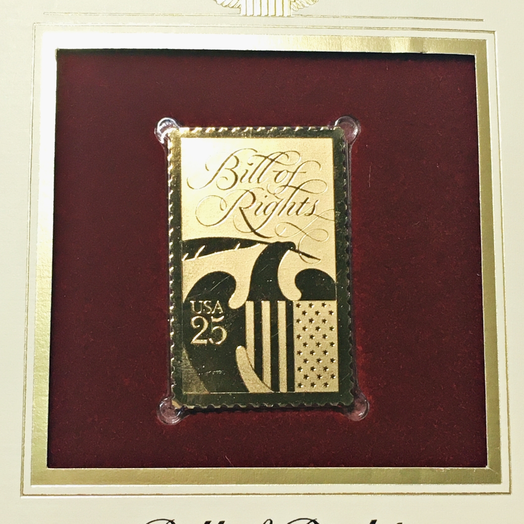 22K Gold Replica Stamp on FDC*1989 Bill of Rights*Postmarked with Original 25c Stamp