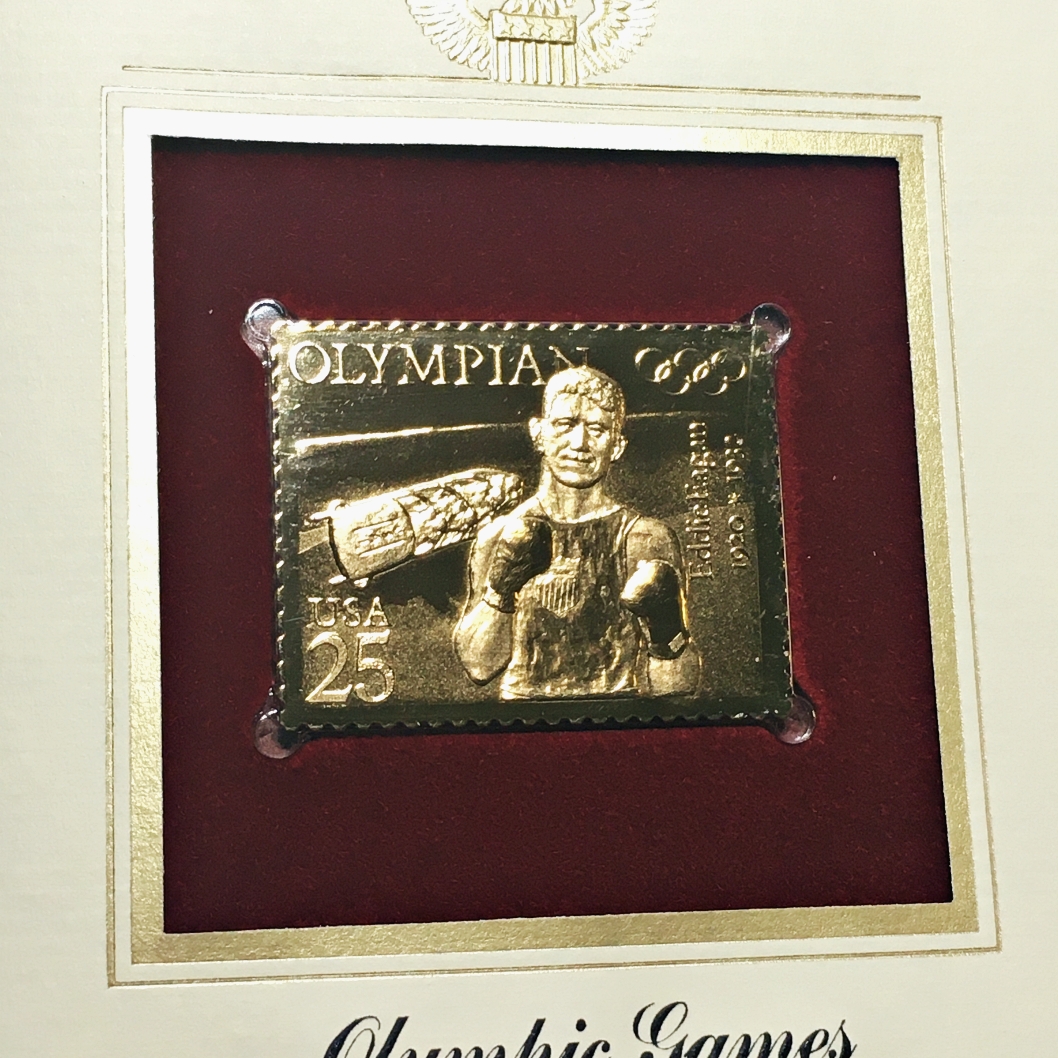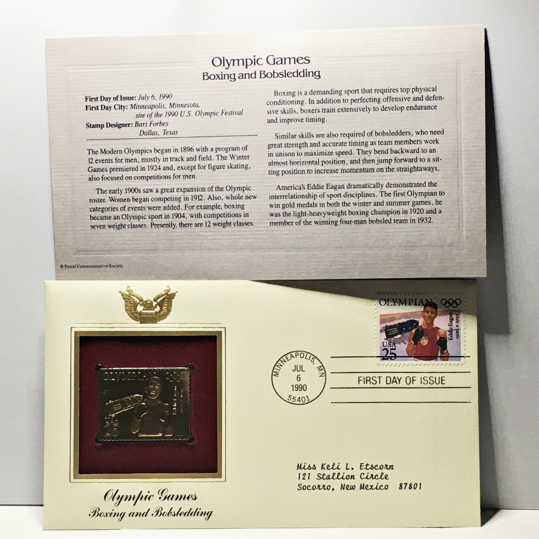 22K Gold Replica Stamp on FDC*1990 Olympic Games; Boxing and Bobsledding*Postmarked w/ Original 25c Stamp