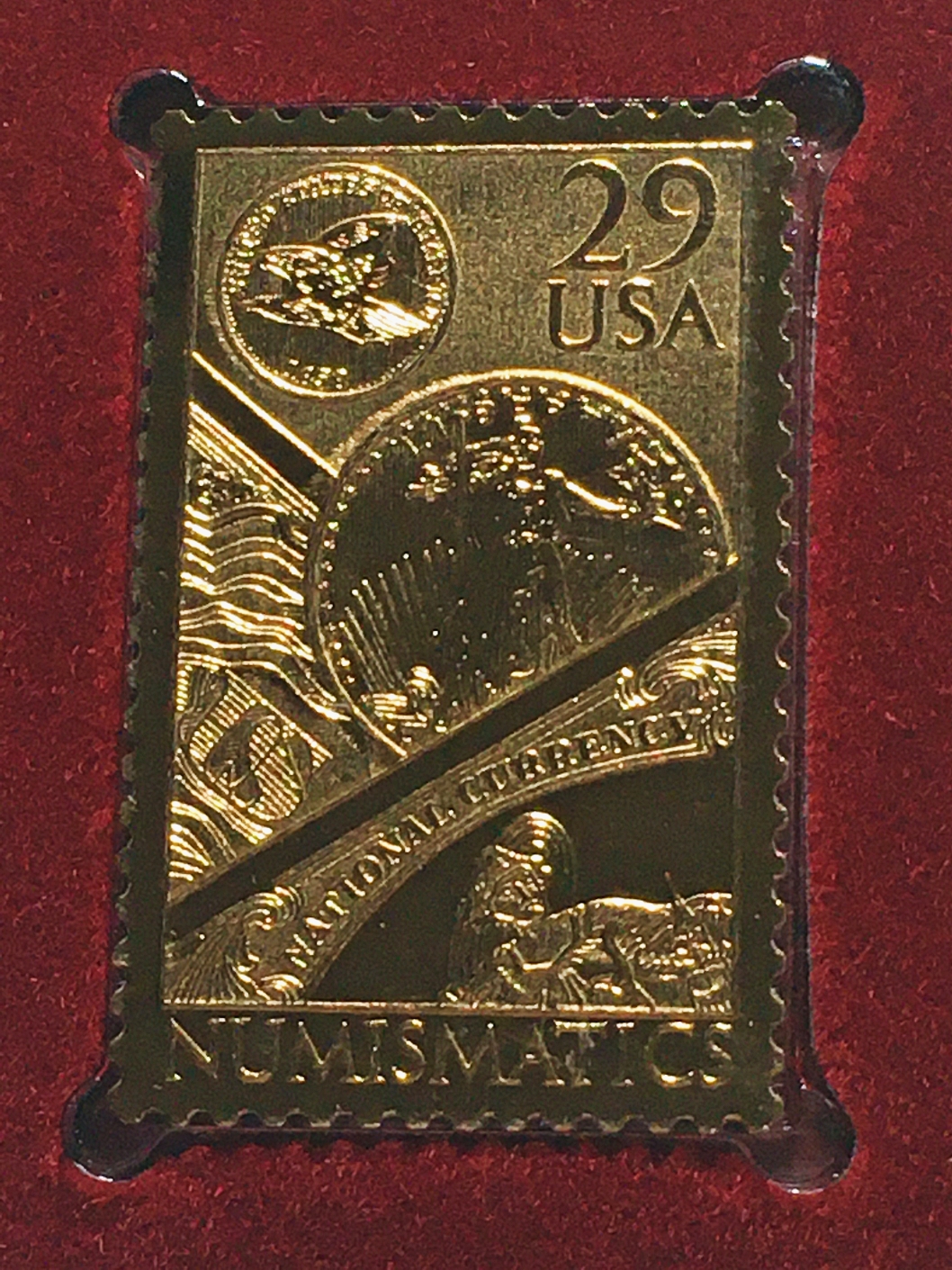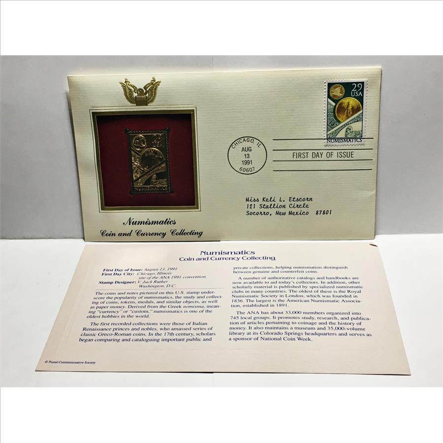 22K Gold Replica Stamp on FDC*1991 Numismatics; Coin and Currency Collecting*Postmarked w/ Original 29c Stamp