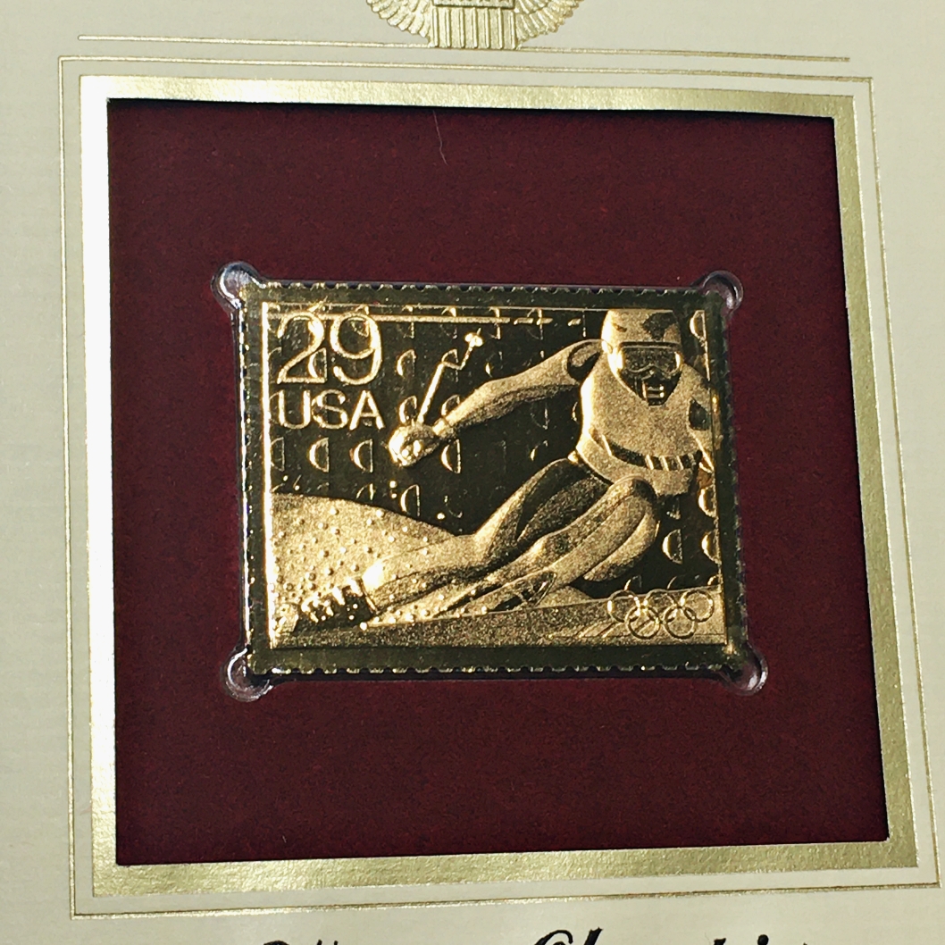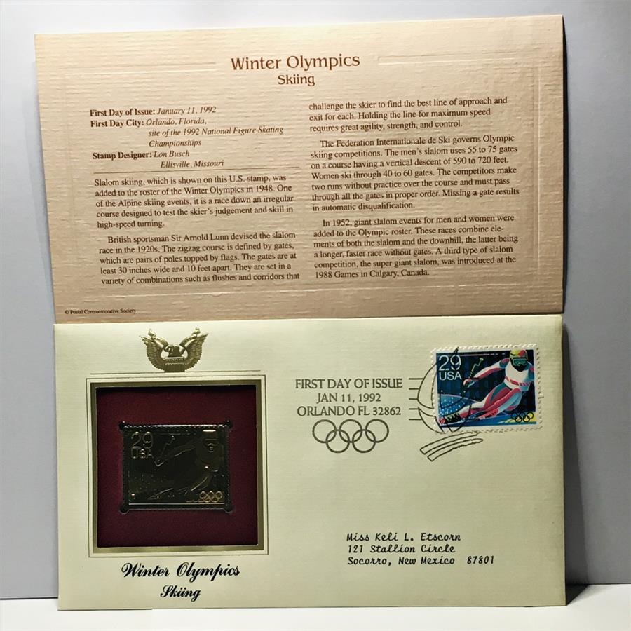 22K Gold Replica Stamp on FDC*1992 Winter Olympics; Skiing*Postmarked w/ Original 29c Stamp