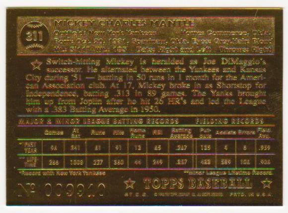 23 KT Gold - MICKEY MANTLE 1996 Topps '52 Rookie Year Limited Edition Card