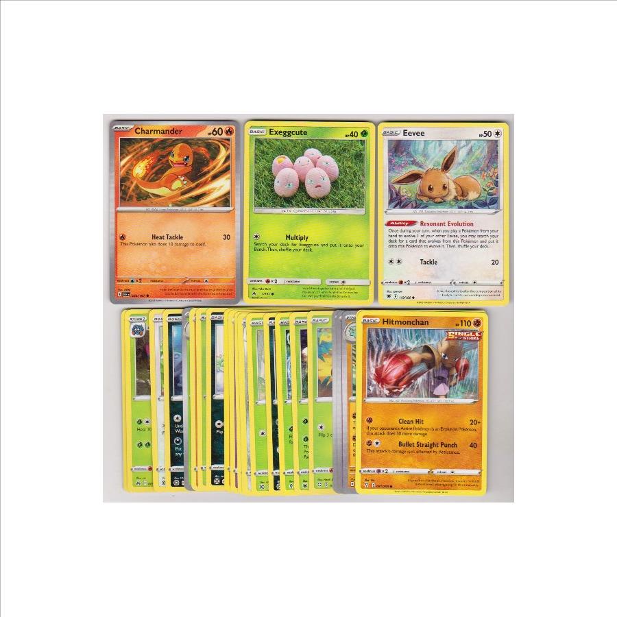 This is a collection of 25 different Pokemon trading cards.  These range from 2018 to 2024.  These are mostly in EX to Near Mint condition.  This lot includes 2023 Charmander, 2018 Exeggcute, 2022 Eevee and more.