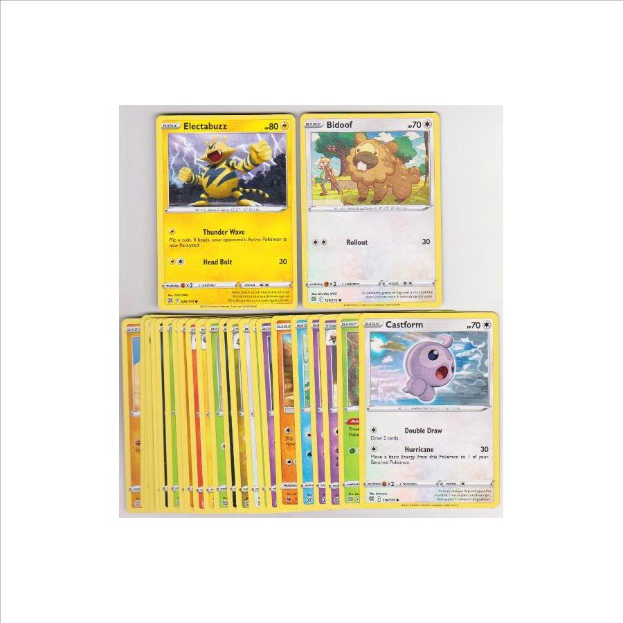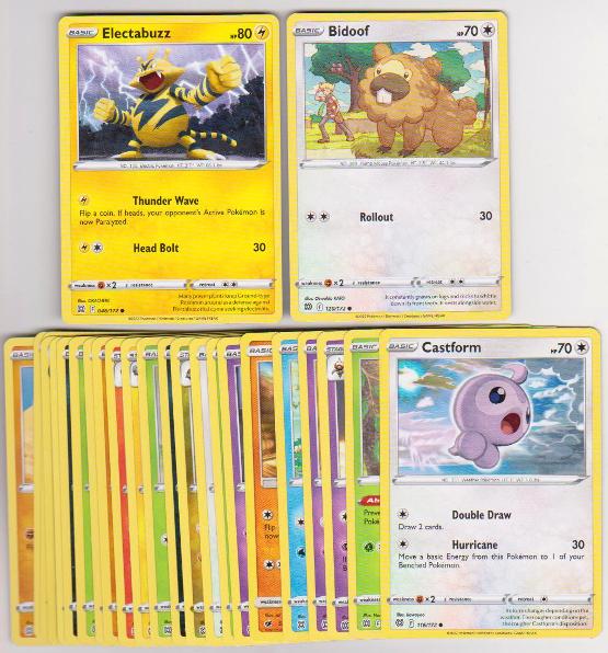 This is a collection of 25 different Pokemon trading cards. This lot includes one 2016, one 2017, and 23 2022 cards. These range from EX to Near Mint condition. This lot includes Electabuzz, Bidoof, Castform, Cherubi, Claydol, Clefairy, Corphish, Cubone, Duskull, Exeggcute, Farfetch'd, Fraxure, Grimer, Karrablast, Luxio, Monferno, Sawk, Shinx, Shroomish, Sneasel, Starmie, Tangrowth, Throh, Cafe Master Trainer, and Trapinch.