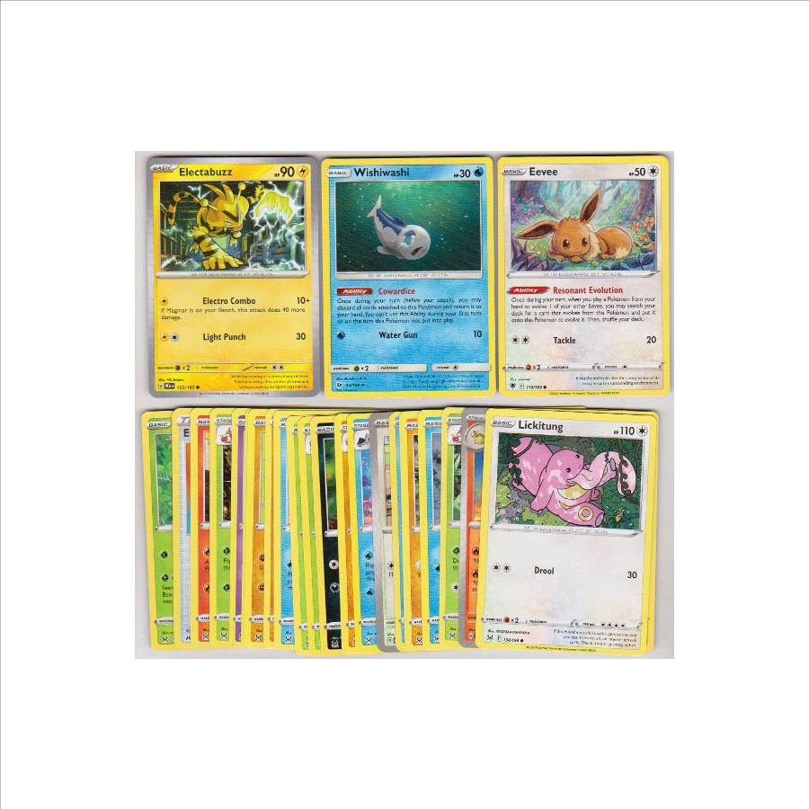 This is a collection of 25 different Pokemon trading cards.  This lot ranges from 2017 to 2024.  These range from EX to Near Mint condition.  This lot includes 2023 Electabuzz, 2017 Wishiwashi, 2022 Eevee, and more.