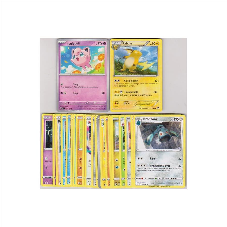This is a collection of 25 different Pokemon trading cards.  These range from 2014 to 2024. These are mostly in EX to Near Mint condition. This lot includes 2023 Jigglypuff, 2014 Raichu, 2022 Bronzong, and more.