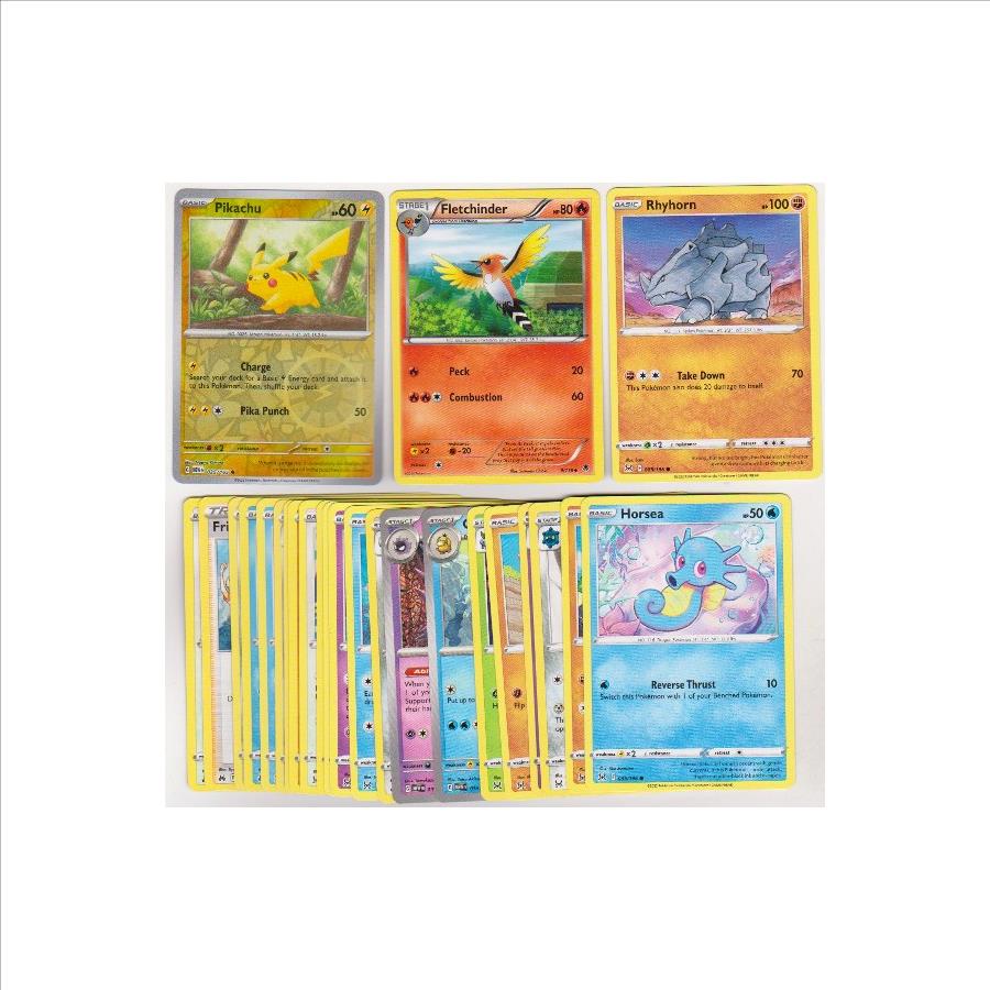 This is a collection of 25 different Pokemon trading cards.  These range from 2014 to 2023.  These are mostly in EX to Near Mint condition.  This lot includes 2023 Pikachu REVERSE HOLO, 2014 Fletchinder, 2022 Rhyhorn, and more.