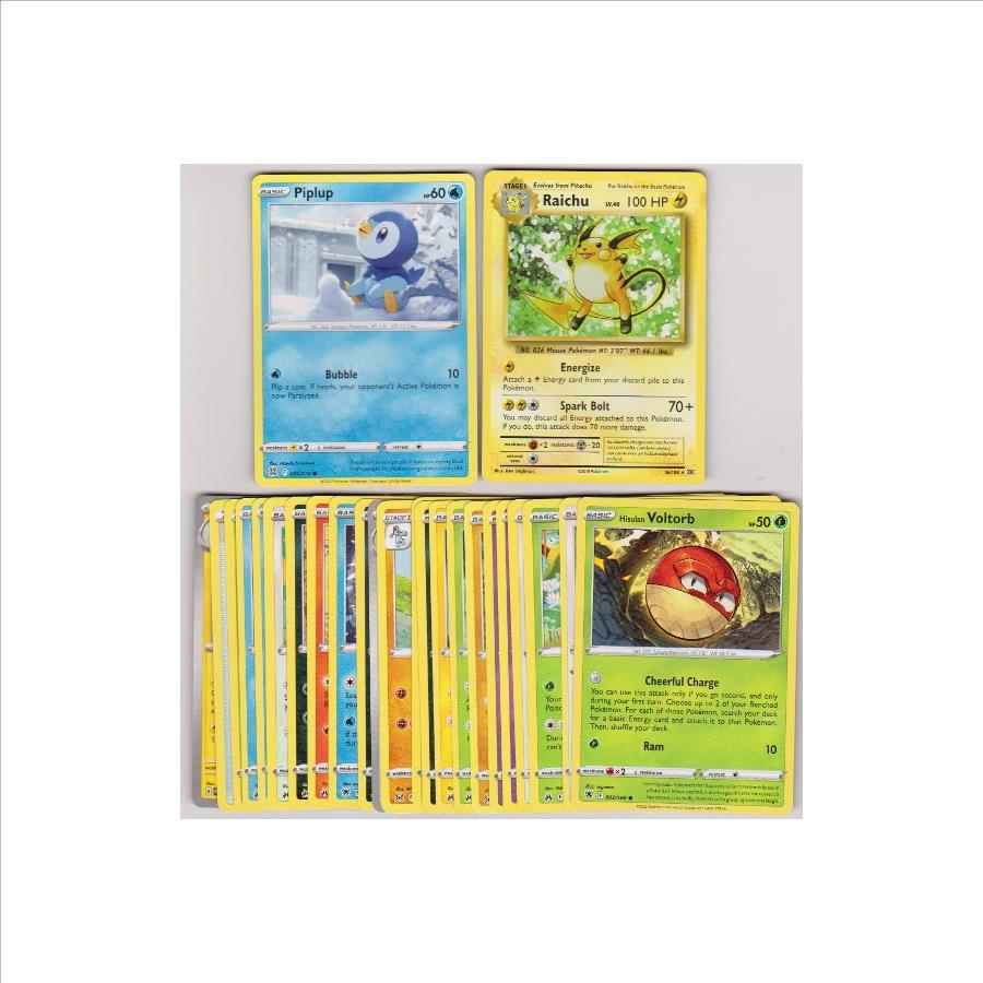 This is a collection of 25 different Pokemon trading cards.  This lot includes a mixture of dates from 2016 to 2024.  Most are in approximately EX to Near Mint condition.  This lot includes 2022 Piplup, 2016 Raichu, 2022 Voltorb, and more.