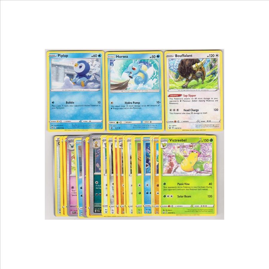 This is a collection of 25 different Pokemon trading cards.  This lot includes a mixture of dates from 2018 to 2024.  Most are in approximately EX to Near Mint condition.  This lot includes 2022 Piplup, 2018 Horsea, 2021 Victreebel, and more.