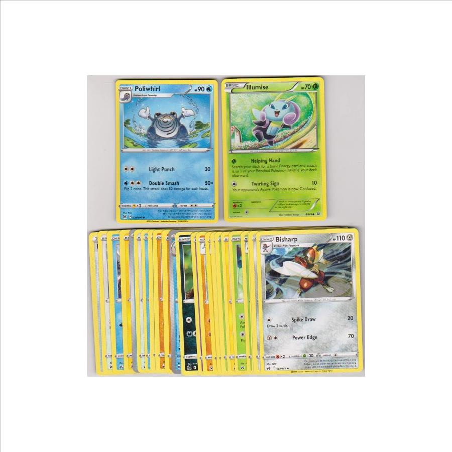 This is a collection of 25 different Pokemon trading cards.  These range from 2015 to 2024.  Most are in approximately EX to Near Mint condition.  This lot includes 2022 Poliwhirl, 2015 Illumise, 2023 Bisharp, and more.