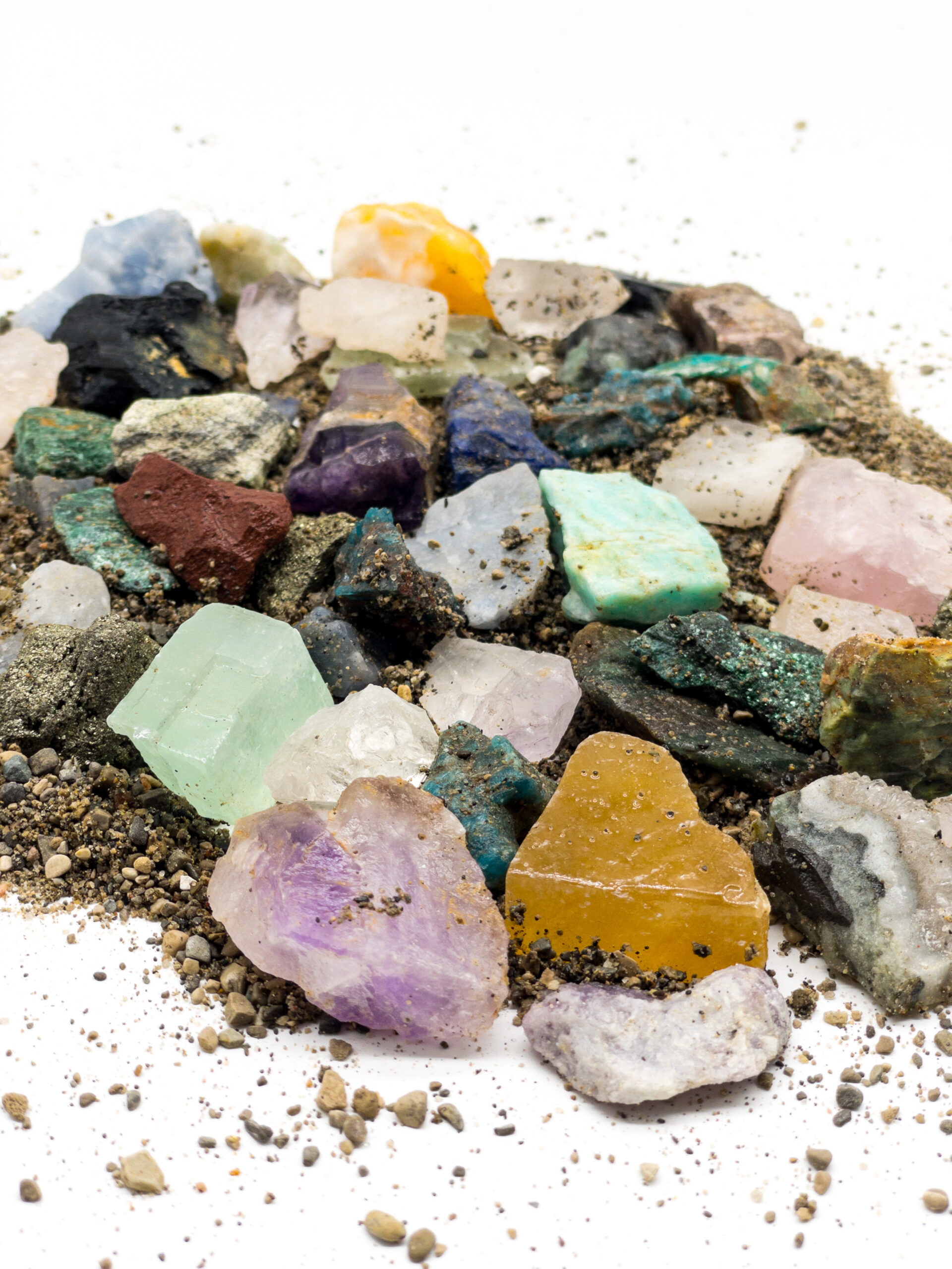 A: All kits are different. Stones, sizes, colors, and quantities will vary. No two kits are the same. We always carry a minimum of 15 different types of crystals/gemstones in stock. Due to supply and transportation from mines, we are always changing the types of stones you will find in our mining buckets.