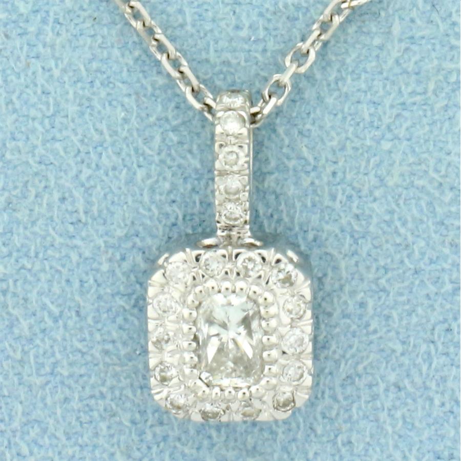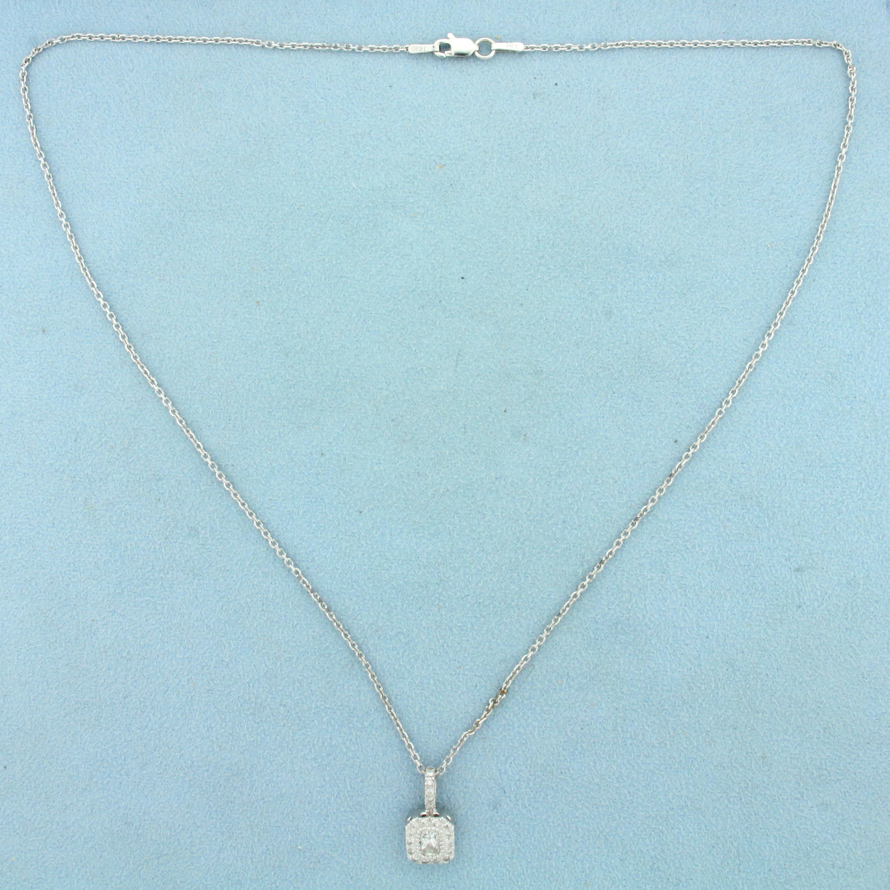 In 14K White Gold. Pendant contains one high quality .55ct radiant cut Diamond, VS clarity/H color. Also contains twenty .01ct round Diamonds of similar high quality. Pendant is 3/4 inch long. Chain is 18 inches long. 0.9mm wide. Lobster clasp. 5.1g