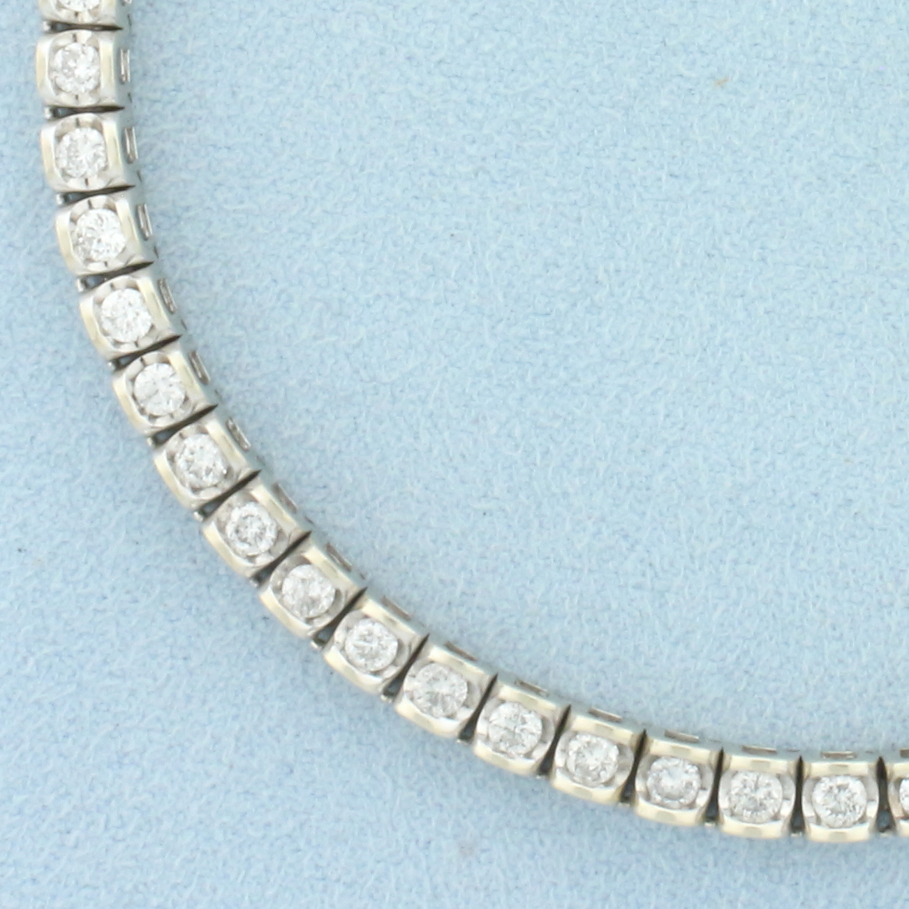 In 14k White Gold. Contains forty-five high quality diamonds, 3ct TW, I clarity/I color, great cut for added brilliance. 7 3/8 inches long. 4mm wide. Concealed slide clasp with safety latch. 17.1g.