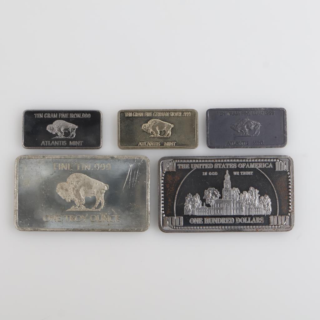 5 Bullion Bars, Tin, Lead, Silver, Iron