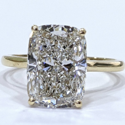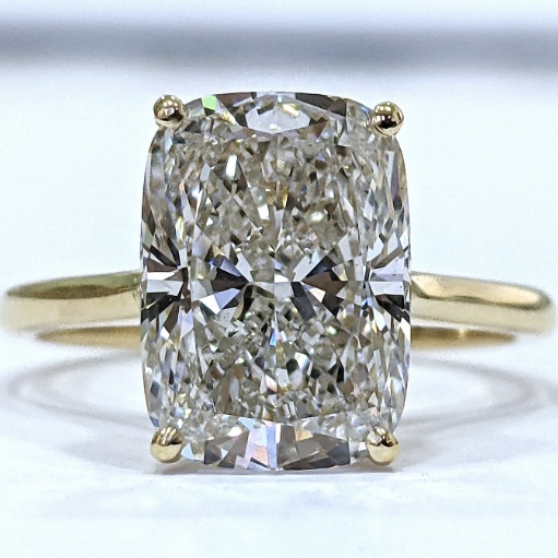 5 Carat CT VS clarity Elongated Cushion Cut lab grown diamond engagement ring set in 14k yellow gold.