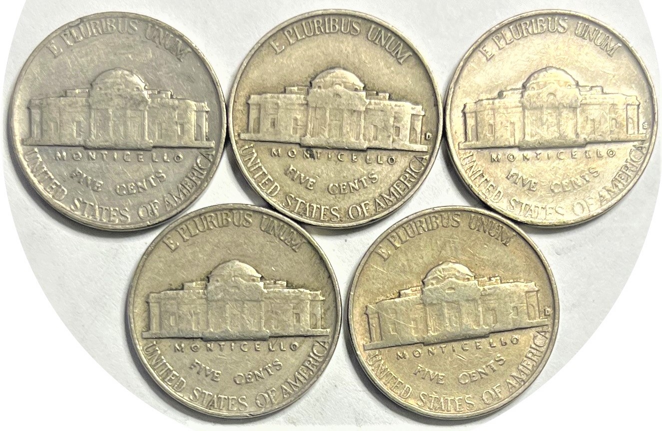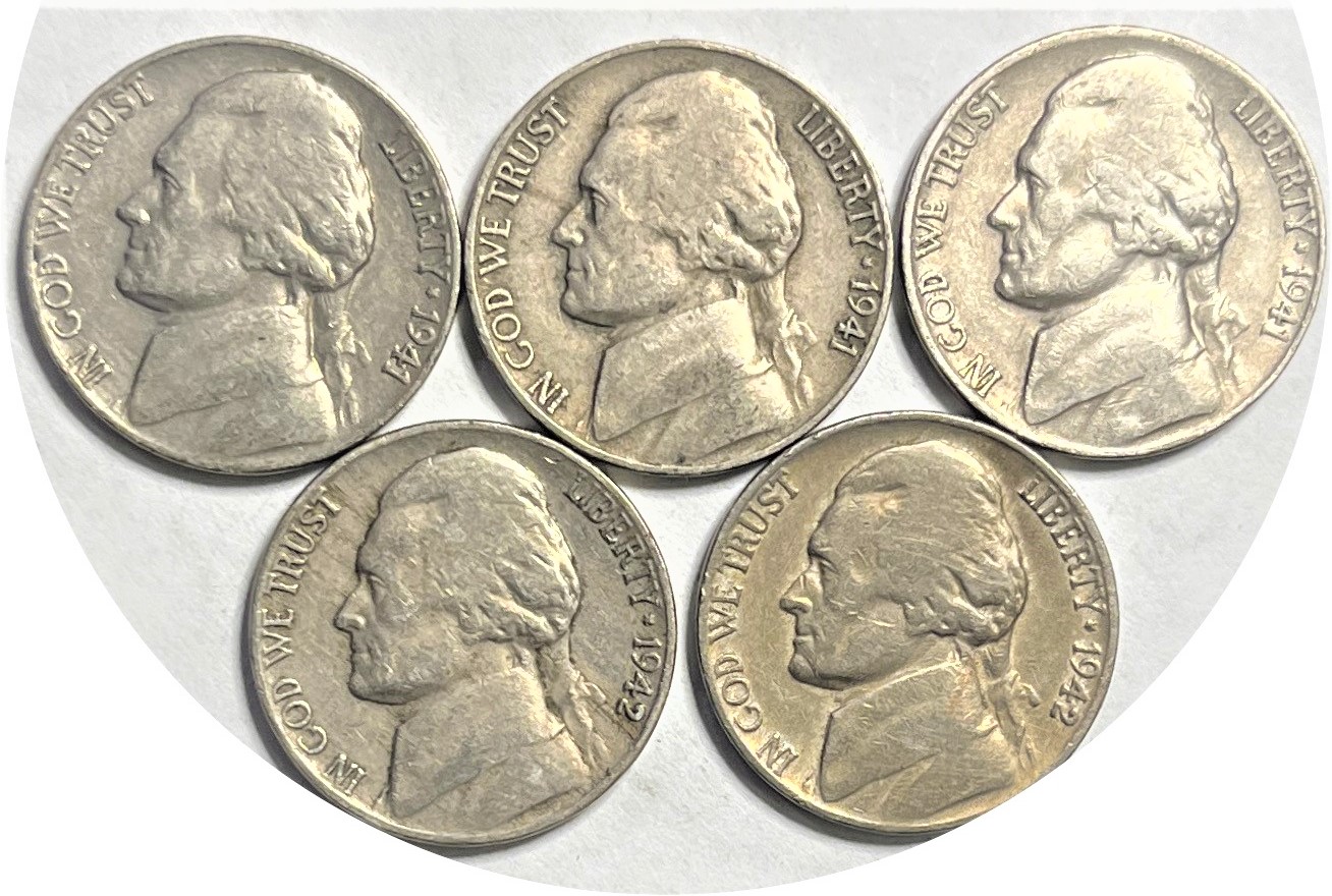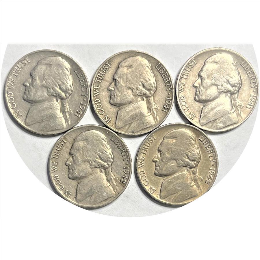(5) Different Early U.S. Jefferson Nickels 1941, 1941-D, 1941-S, 1942 & 1942-D (Scarce) Early Nickels