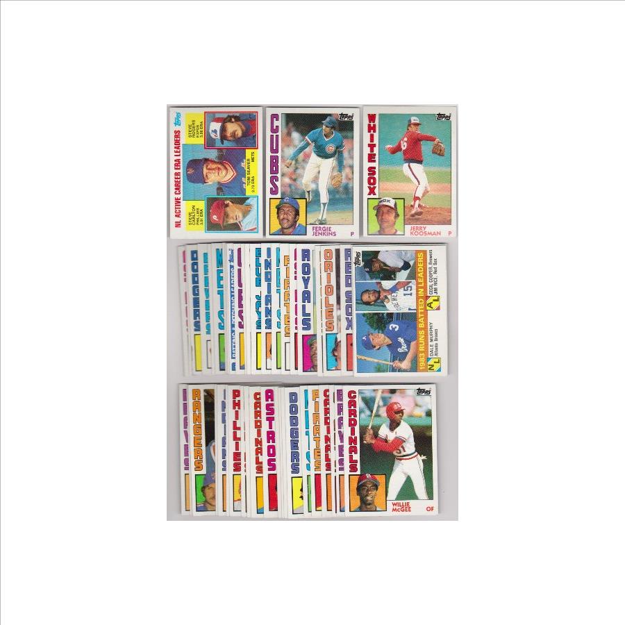 This is a lot of 50 Different 1984 Topps baseball cards. Most of these are in EX-MT or better condition.  Some will be a little higher or lower grade.  This lot includes:  Steve Carlton/Tom Seaver/Steve Rogers, Fergie Jenkins, Jerry Koosman, Dale Murphy/Cecil Cooper, and more.
