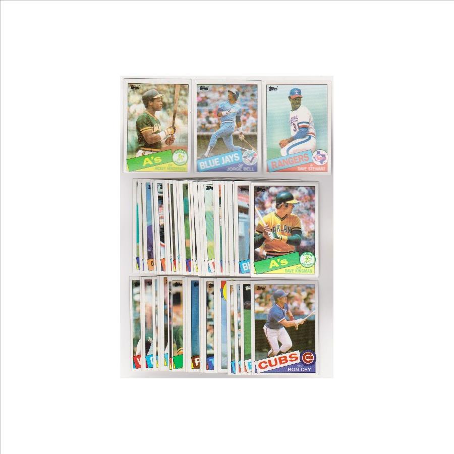 50 Different 1985 Topps baseball cards. These average EX to EX-MT condition.  Some will be a little higher or lower grade.  Most are off center, but overall it is a nice looking lot. This lot includes Rickey Henderson, Jorge Bell, Dave Stewart, Ron Cey , and more.