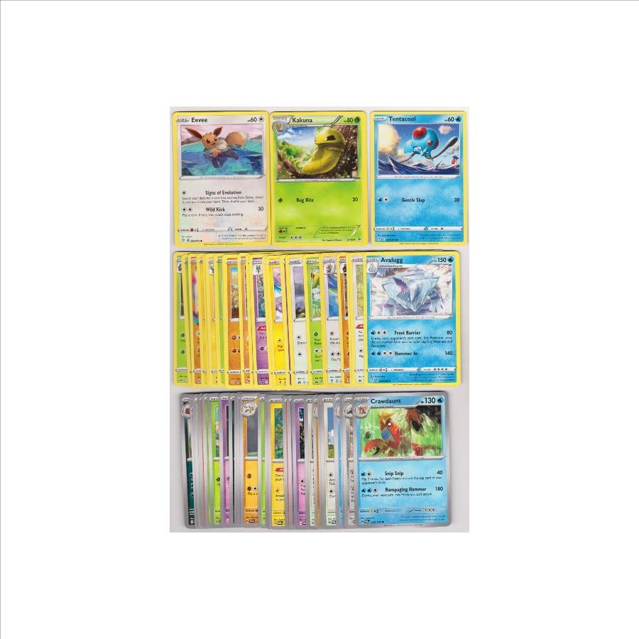 This is a collection of 50 different Pokemon trading cards.  These range from 2015 to 2024.  These are mostly in EX to Near Mint condition.  This lot includes 2021 Eevee, 2015 Kakuna, 2021 Tentacool, and more.