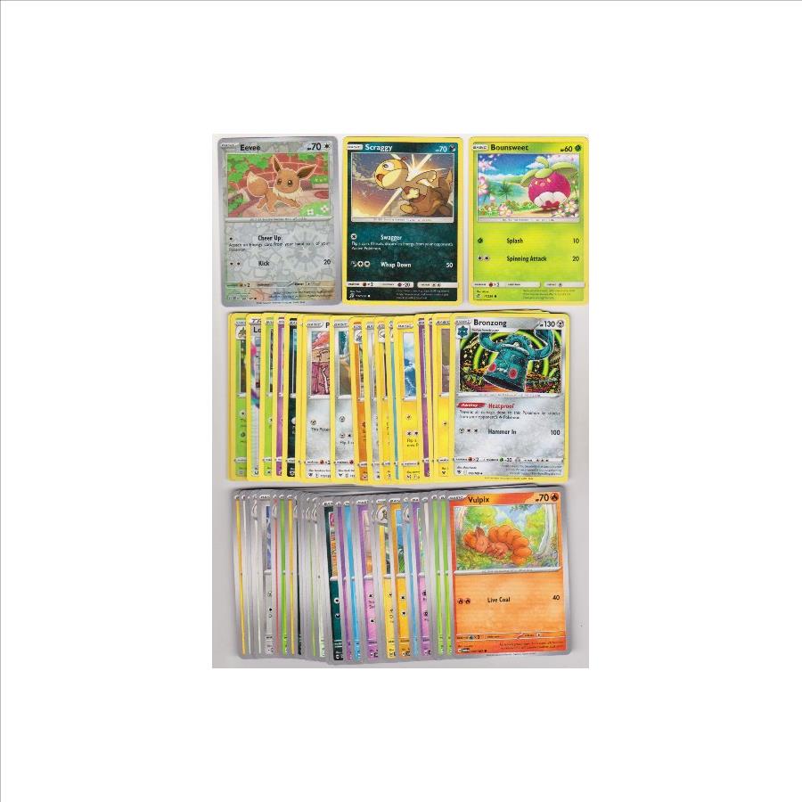 This is a collection of 50 different Pokemon trading cards.  These range from 2019 to 2025.  These are mostly in EX to Near Mint condition.  This lot includes 2023 Eevee Reverse Holo, 2019 Scraggy, 2019 Bounsweet, and more.