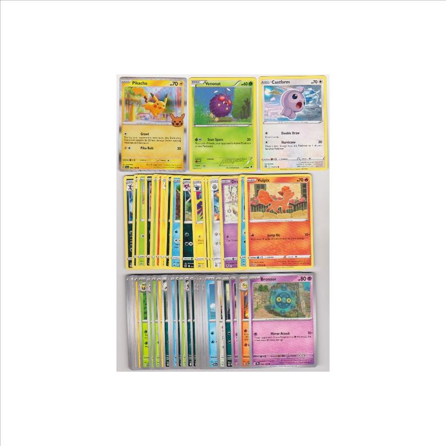 This is a collection of 50 different Pokemon trading cards.  These range from 2014 to 2025.  These are mostly in EX to Near Mint condition.  This lot includes 2023 Pikachu Trick Or Trade HOLO, 2014 Venonat, 2022 Vulpix, and more.