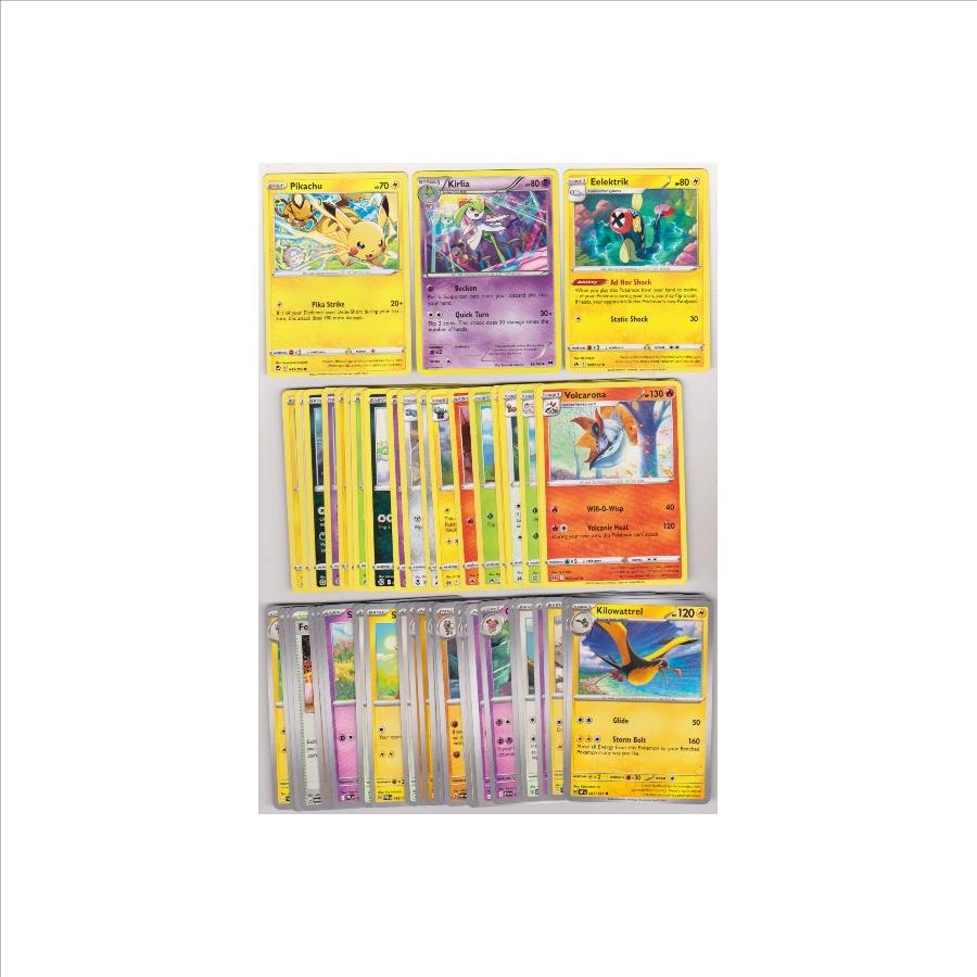 This is a collection of 50 different Pokemon trading cards.  These range from 2015 to 2025.  These are mostly in EX to Near Mint condition.  This lot includes 2022 Pikachu, 2015 Kirlia, 2023 Eelektrik, and more.