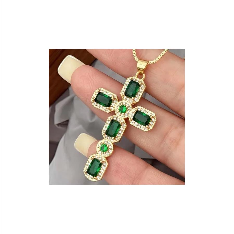 5.50ctw Emerald & White Sapphire 18k Yellow Gold Overlay Cross Necklace