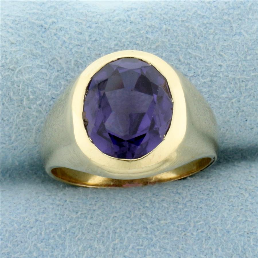In 10K Yellow Gold. Contains one high quality natural 12x10mm oval cut color changing lab sapphire that changes from purple to red depending on light source. Size 9. 6.3g.