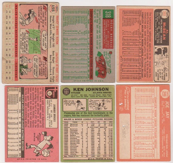 This is a collection of 6 different 1950's/1960's Topps baseball cards.  These are mostly in Poor condition.  They have wear/creases/damage/markings/etc.  This lot includes: