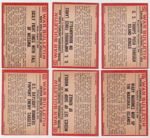 This is a collection of 6 different 1965 Philadelphia World War 2 Trading cards.  This is a nice lot that averages EX condition.  This lot includes #37, 33, 30, 29, 28 and 25 from the set.  These are original 53 year old cards.