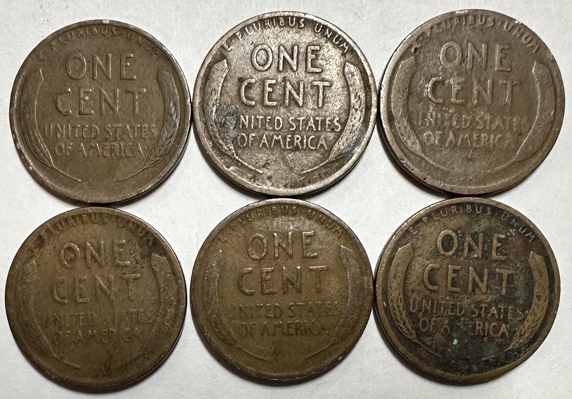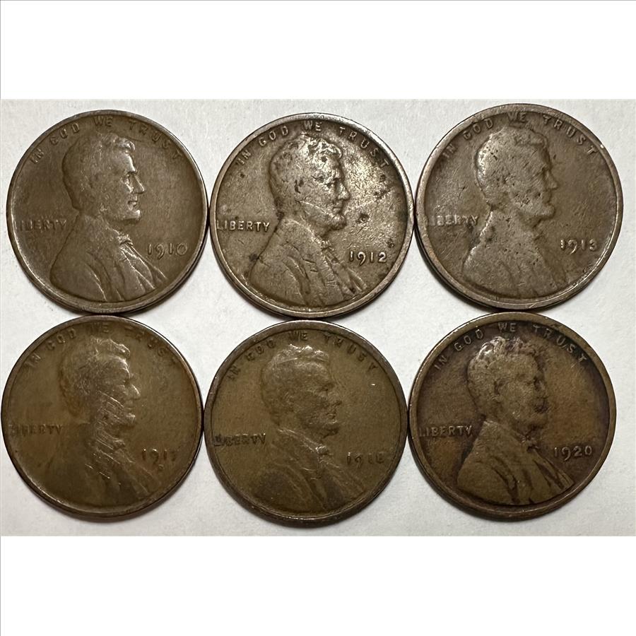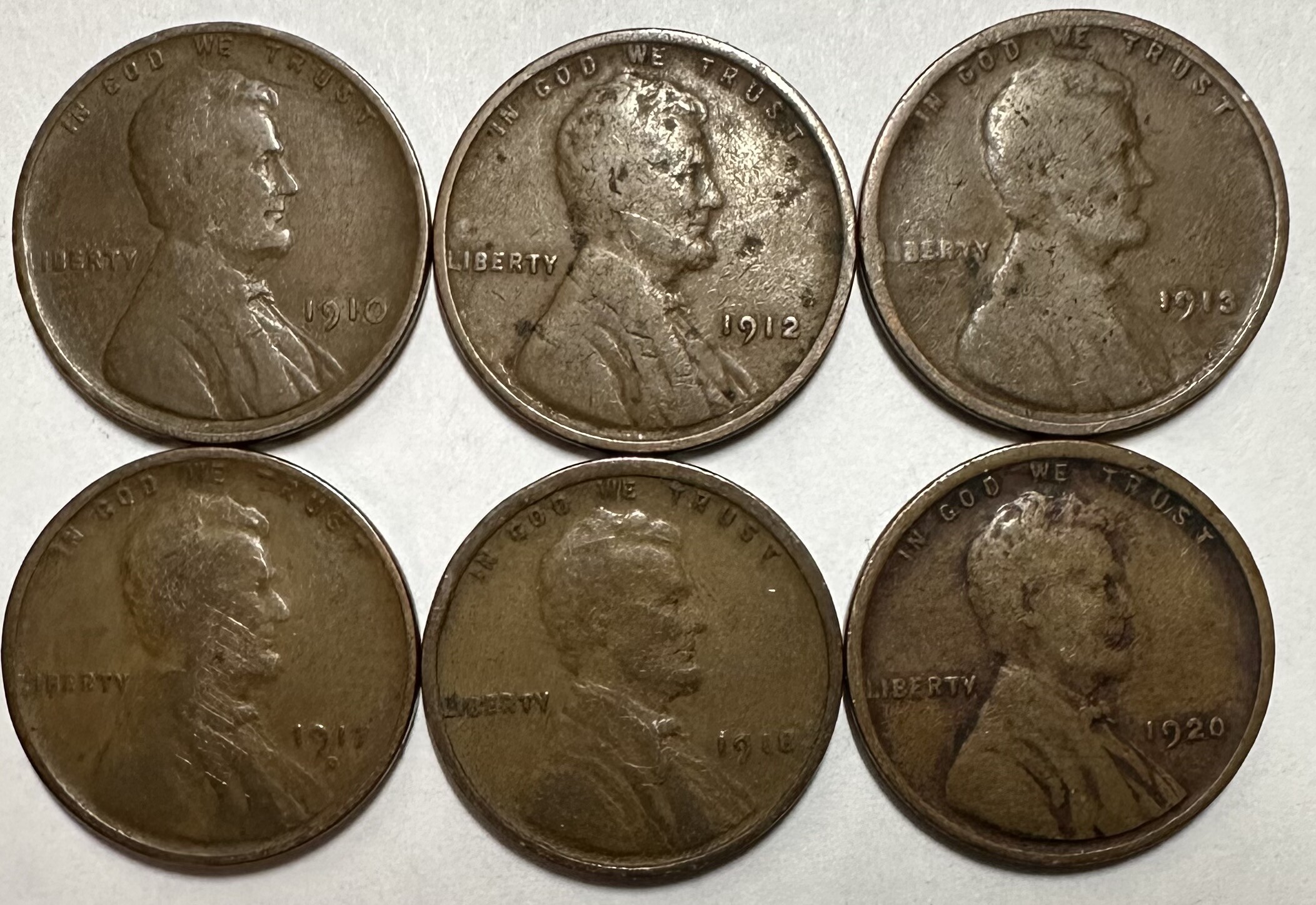 >(6) U.S. Lincoln Wheat Cents - 1910, 1912, 1913, 1917-D, 1918 and 1920 - 6 Early Dated Cents