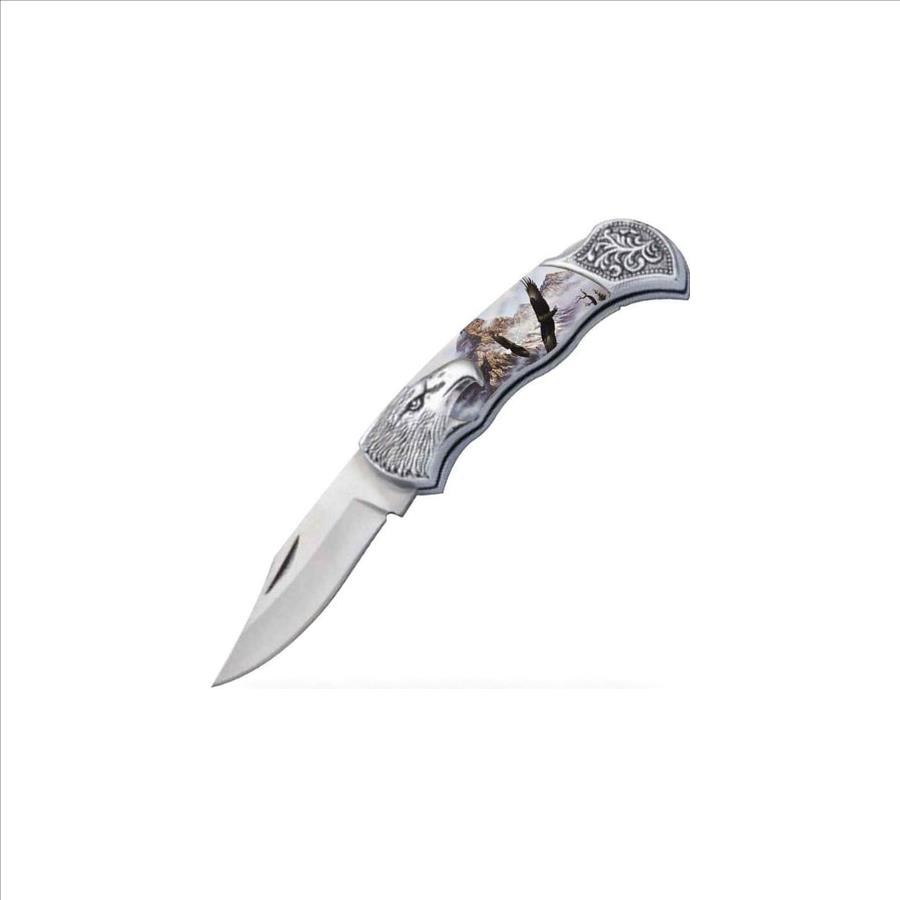 Eagle Bolster Handle shaped lockback folding pocket knife. This pocket knife with gift box case would make a great gift. The distinct and uniquely crafted pocket knife handle measures 4.25" long. The durable, fully functional stainless steel blade measures 3" long.P