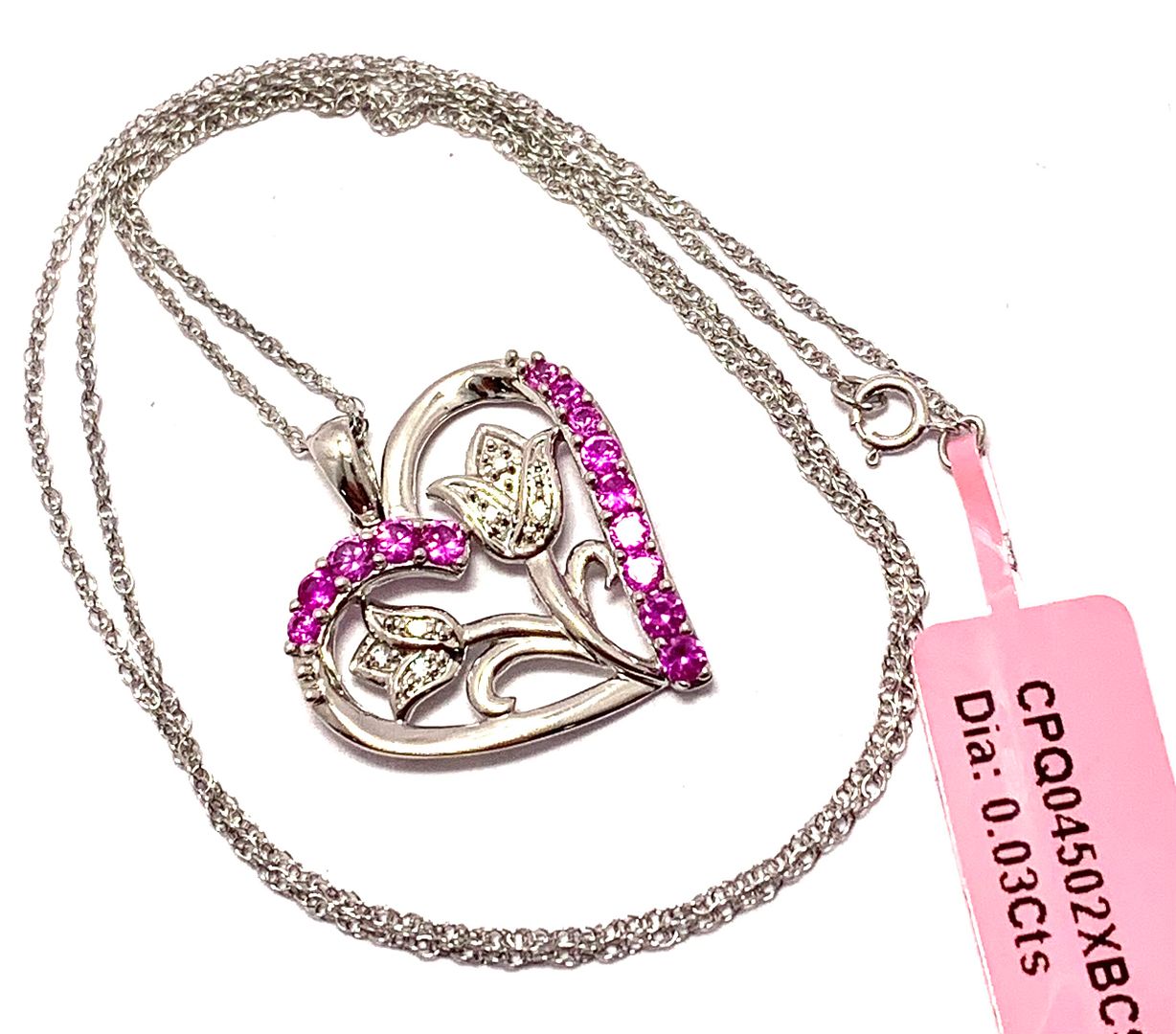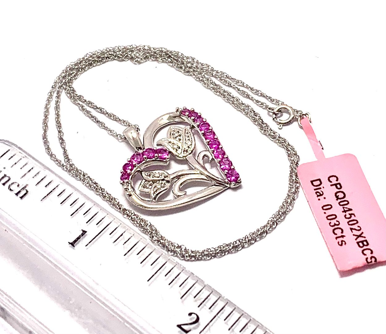 $89 Retail .925 Sterling Silver & 18k WG 0.03ctw Genuine Diamond & 0.50ctw Pink Topaz Heart Necklace