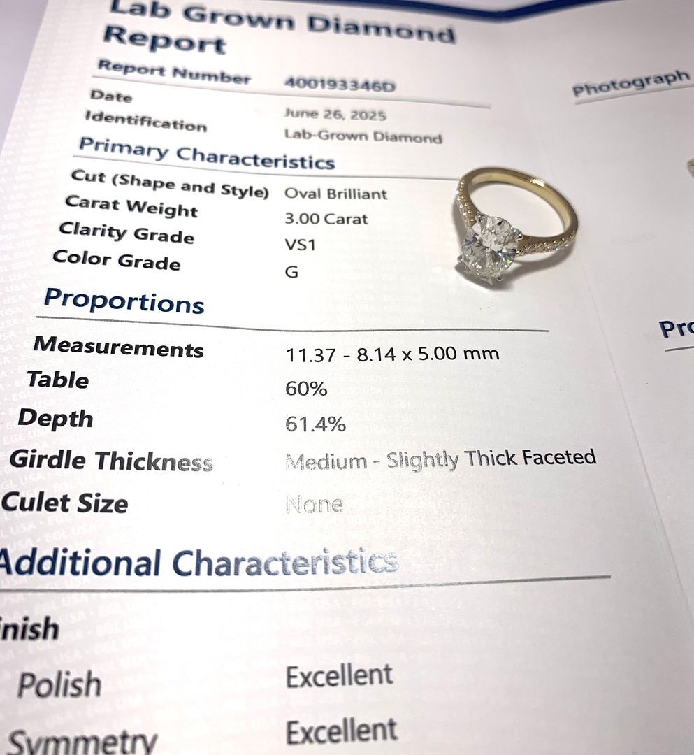 Gemstone Type:   Center: Lab Grown Oval Brilliant 3.00ct G , VS1.
