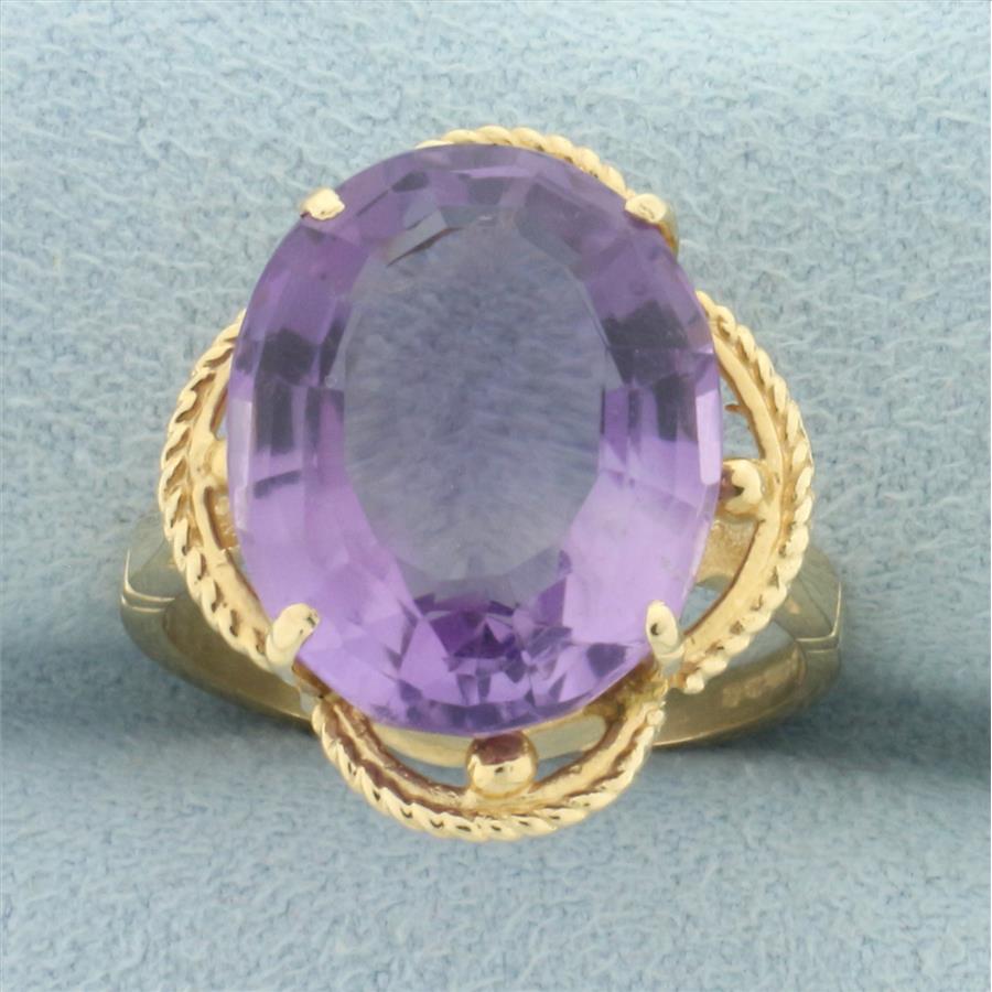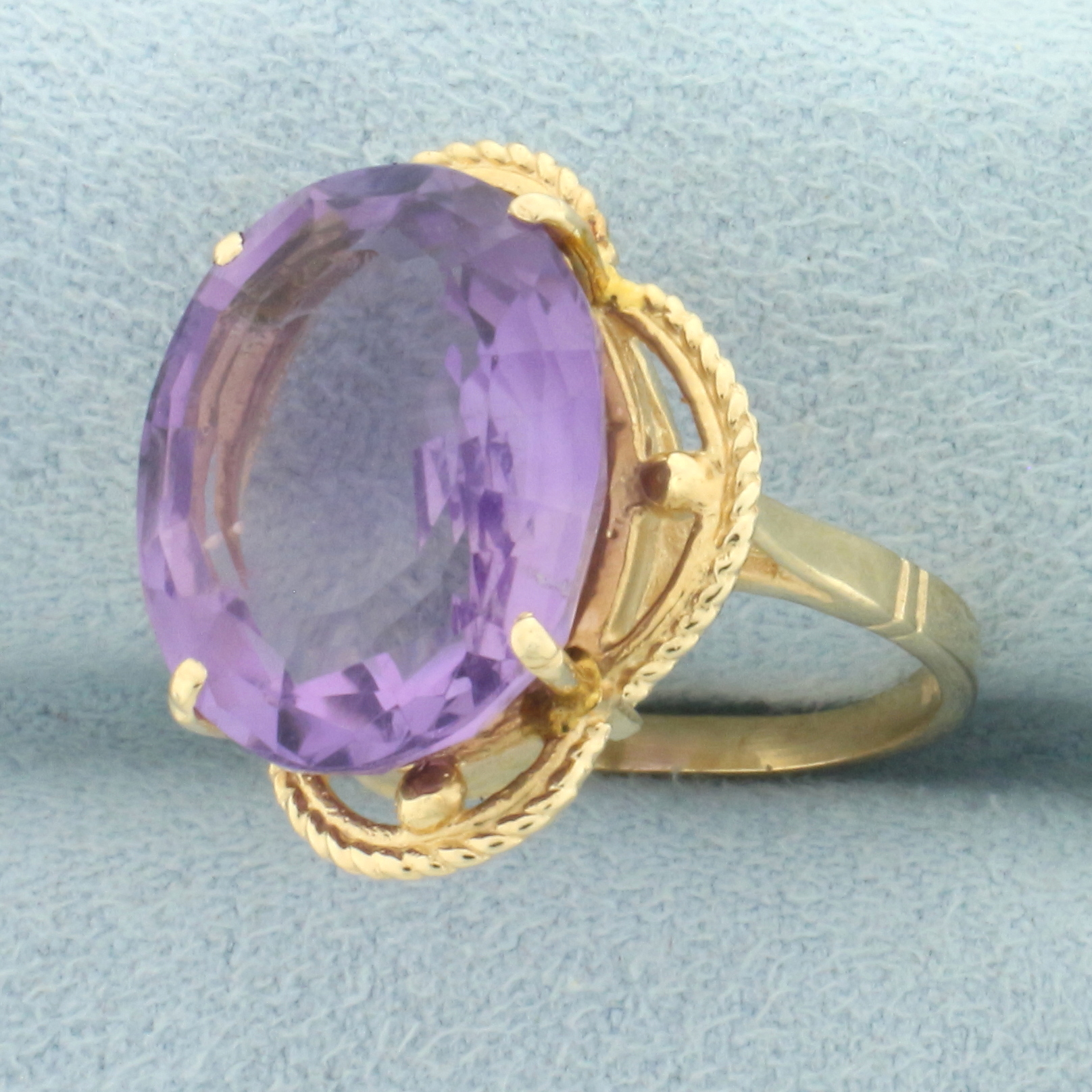In 14k yellow gold. Contains one high quality natural fancy oval step cut amethyst gemstone with bright color and excellent clarity. Size: 6.5. 5.4g.