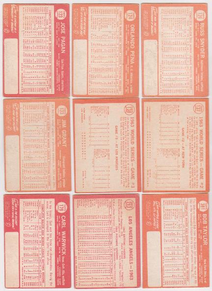 This is a collection of 9 different 1964 Topps Baseball cards.  These are mostly in Good to VG-EX condition.  Some may be slightly higher or lower grade.  This lot includes #123, 124, 126, 133, 137, 138, 179, 213, and 381 from the set.