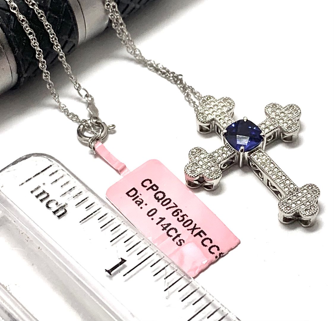 .925 Sterling Silver & 14k Gold 0.14ctw Natural Diamonds & 1.00ct Sapphire Antique Design Cross Necklace