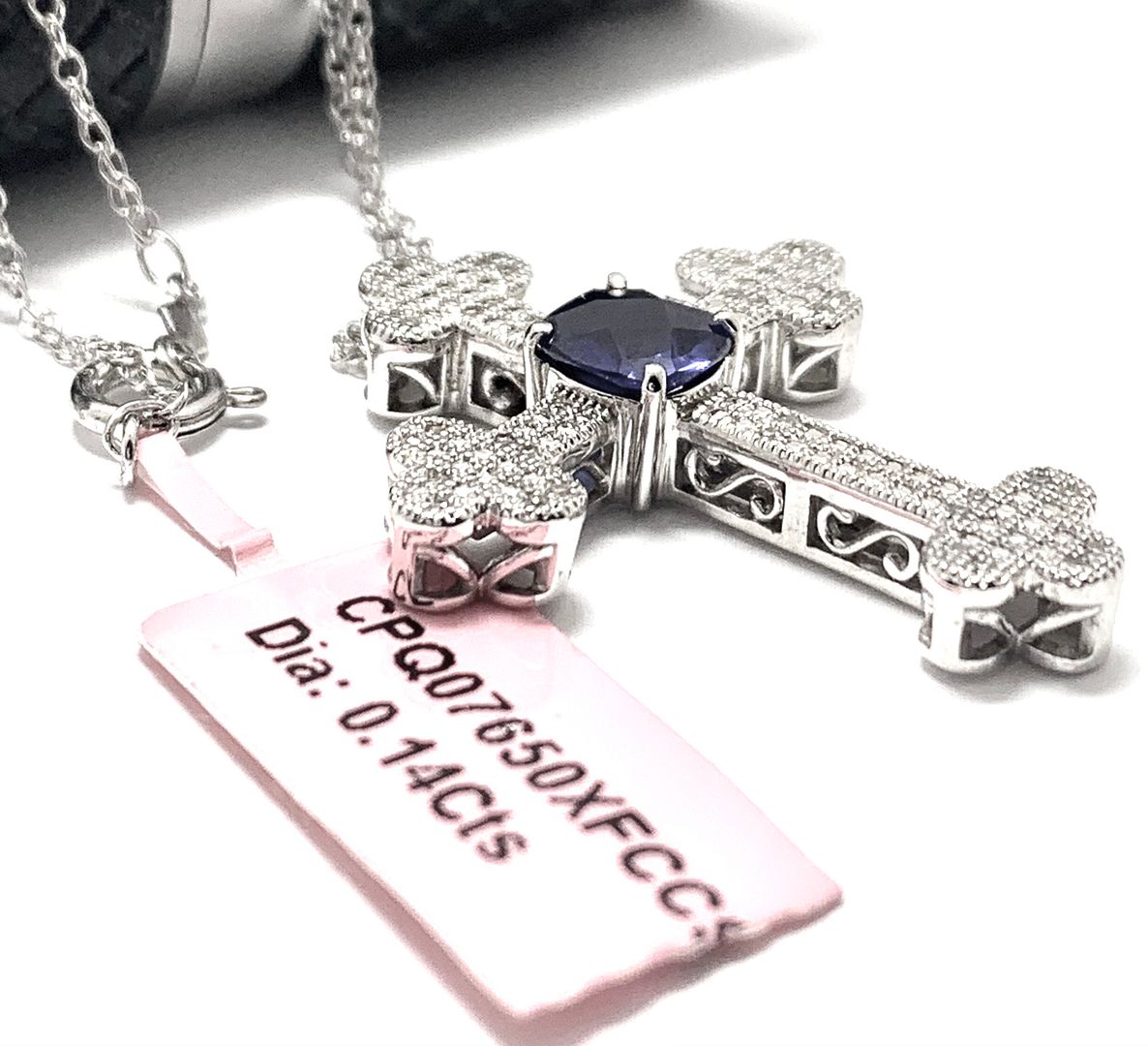 .925 Sterling Silver & 14k Gold 0.14ctw Real Diamond & 1.00ct Sapphire Antique Design Cross Necklace