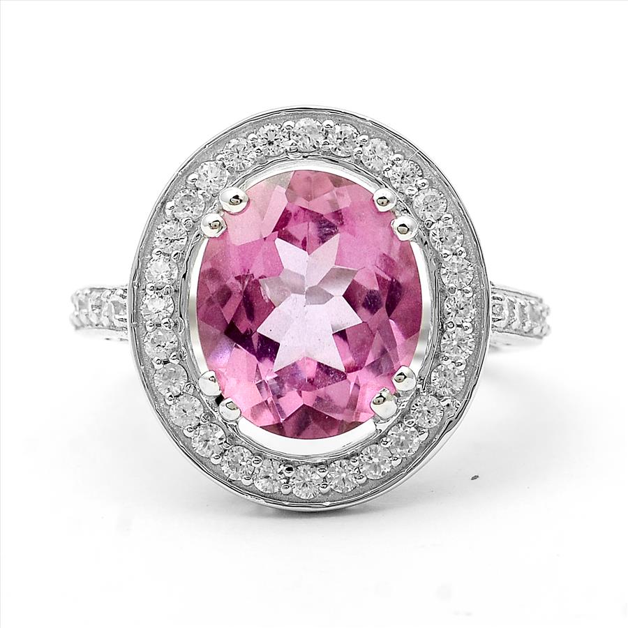 925 Sterling Silver 5.72 Ct Oval Pink Topaz White Zircon Ring 7 US Ring Size